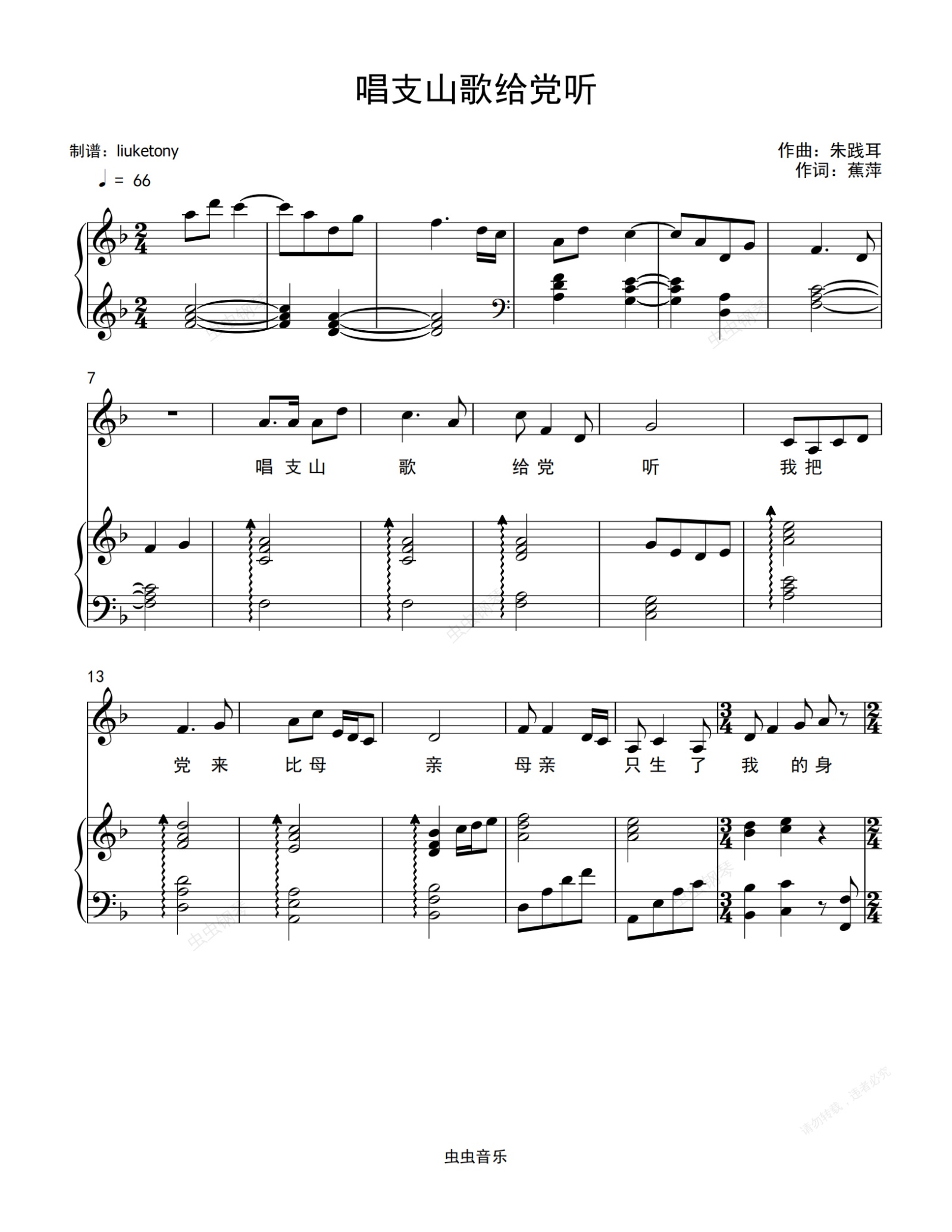 钢琴谱:唱支山歌给党听 F调伴奏谱