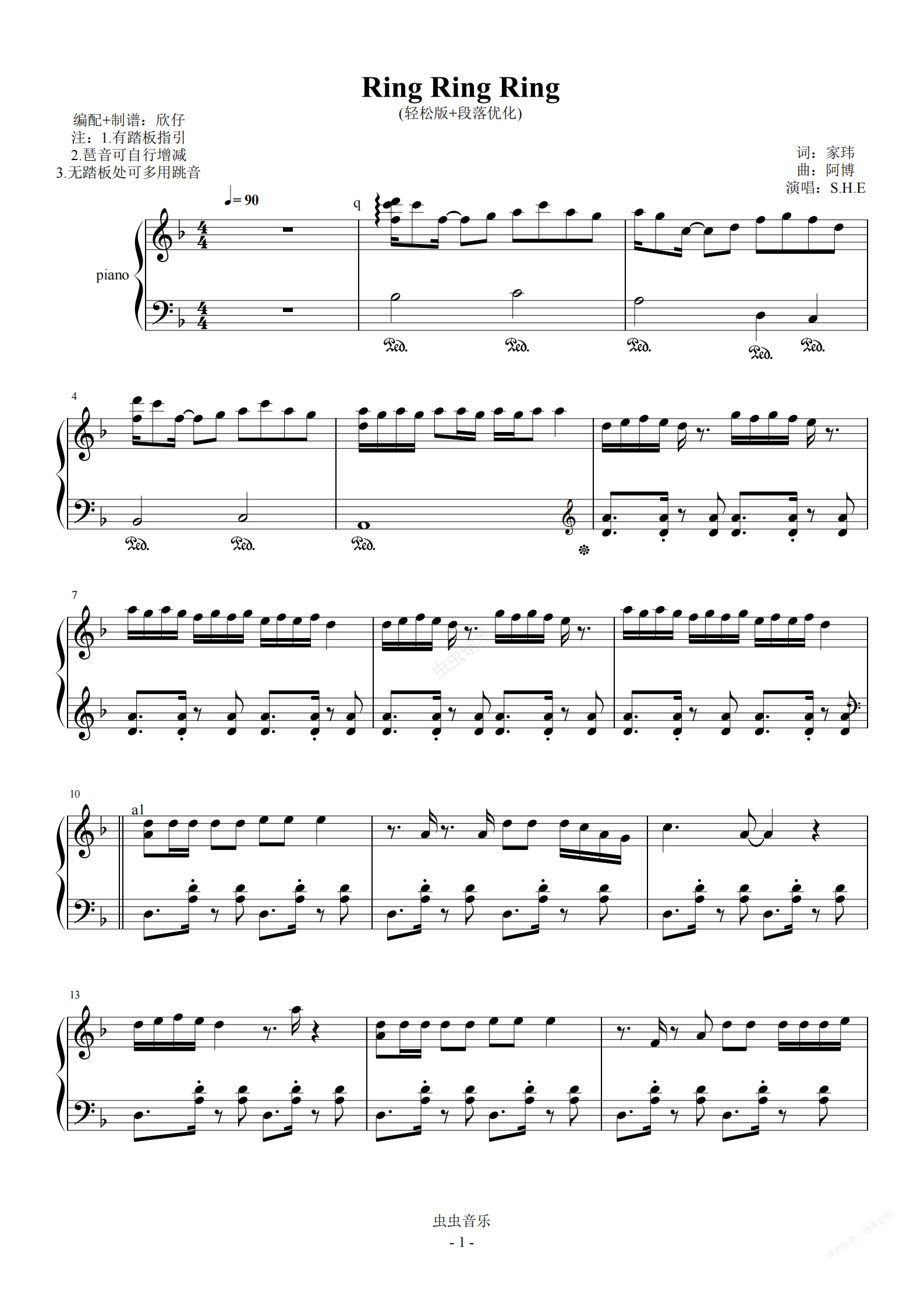 钢琴谱:S.H.E-F调《Ring Ring Ring》(轻松跳跳版+段落优化)