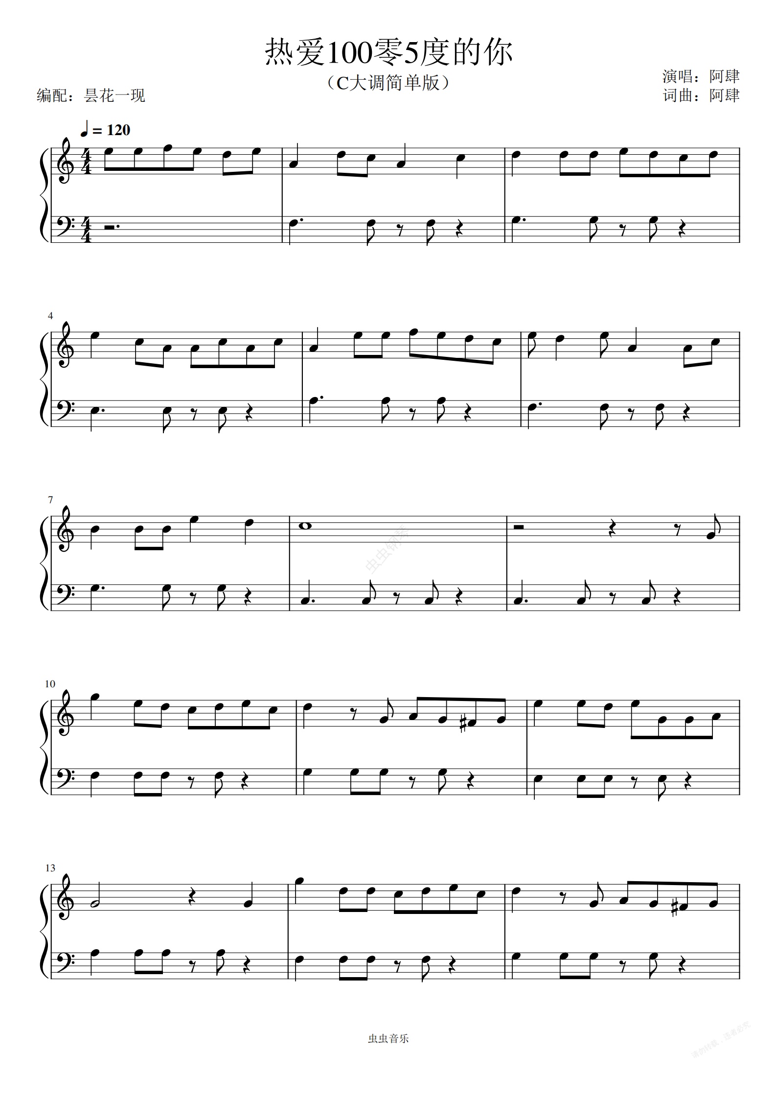 钢琴谱:热爱105度的你-C调简单版(精简)