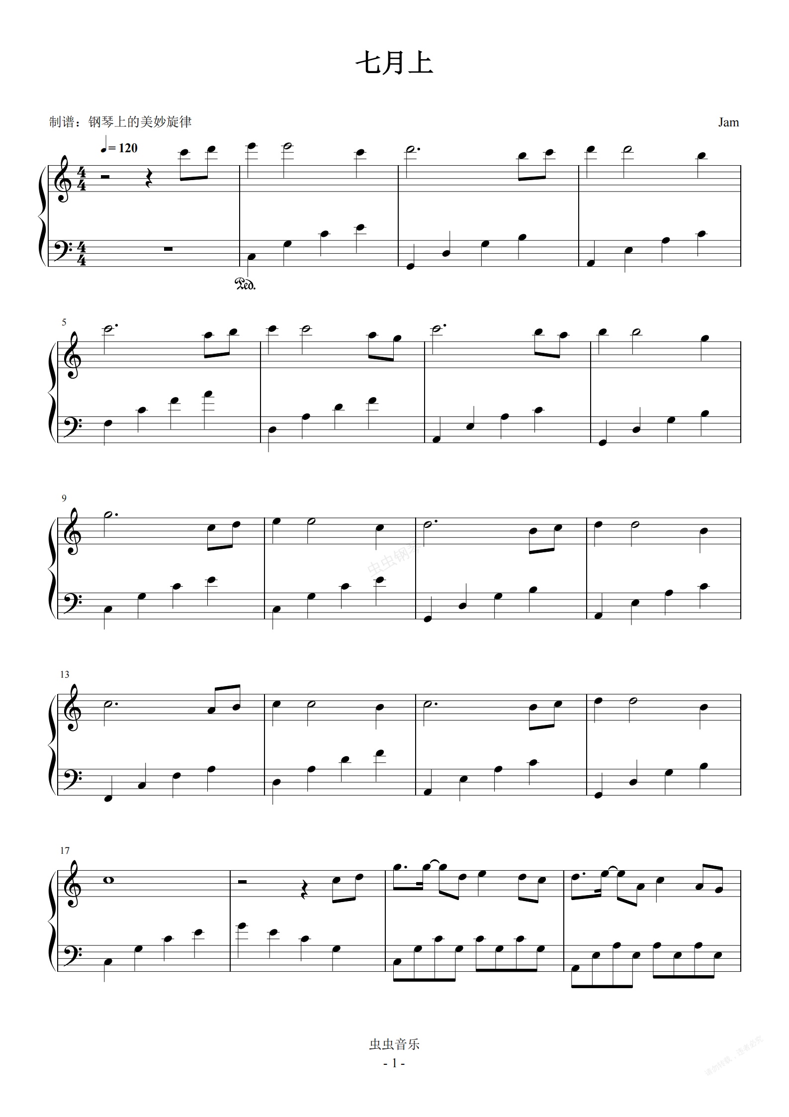 钢琴谱:七月上 C调简易版