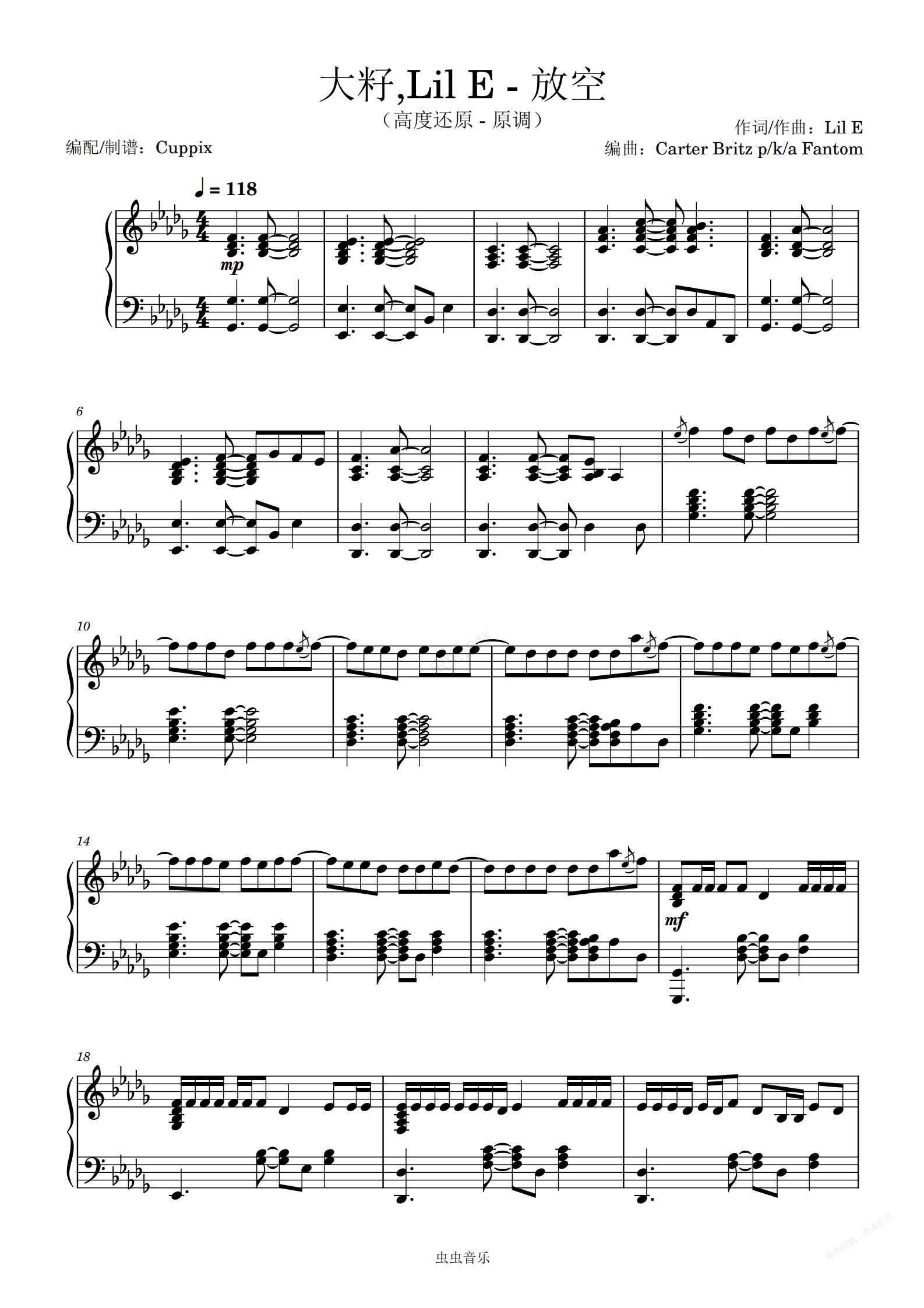 钢琴谱:《放空》Cuppix编配-高度还原-原调(大籽,Lil E)