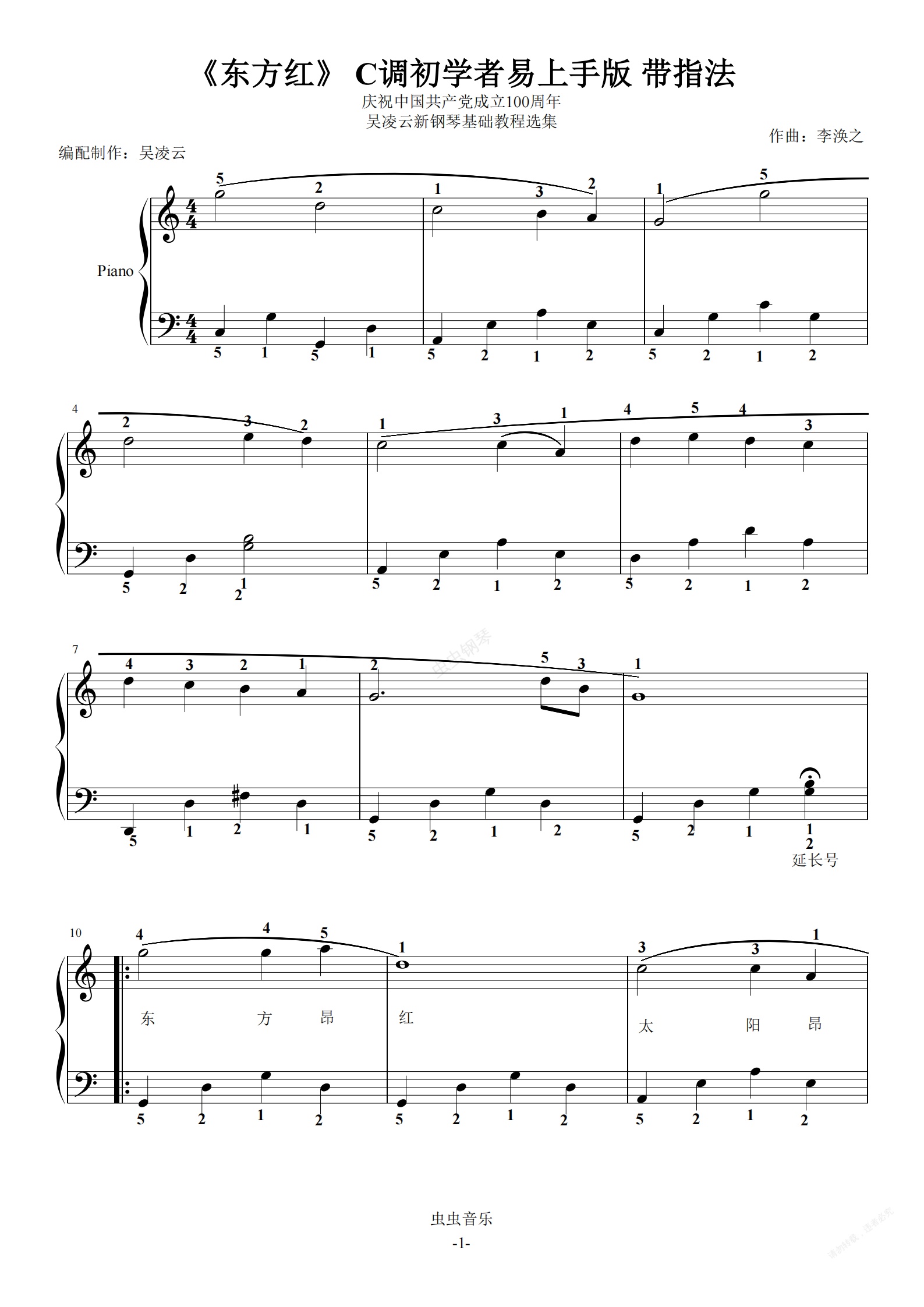 钢琴谱:东方红 C调初学者易上手版 带指法 吴凌云新钢琴基础教程选集