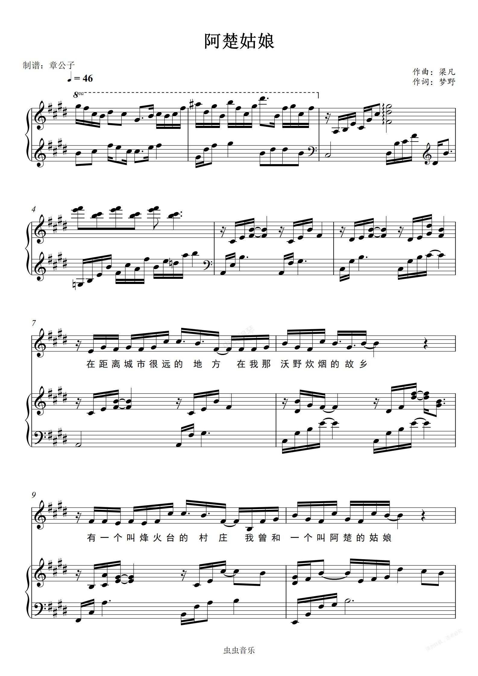 钢琴谱:阿楚姑娘-袁娅维 完美E调弹唱