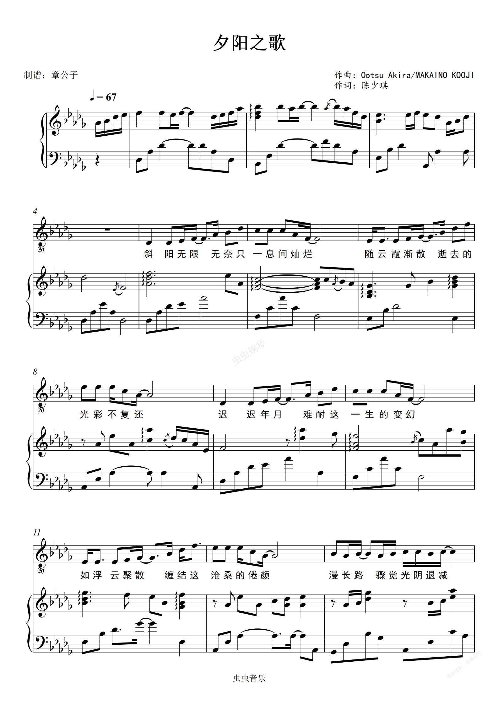 根据梅艳芳版粤语歌曲《夕阳之歌》编配制作而成纯钢琴版伴奏谱,千千阙歌、风中的承诺与这首歌是同旋律,所以钢琴伴奏可以通用,调性和段落可能会有不同。