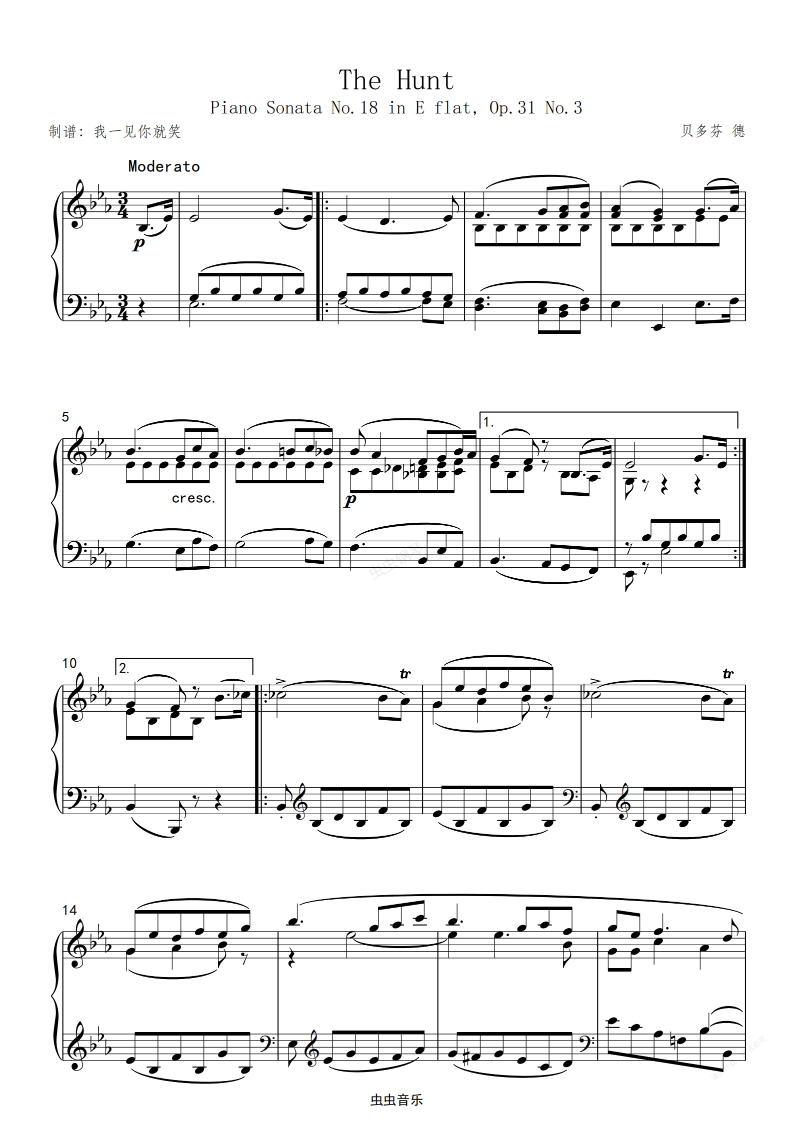 该曲是《狩猎》的第三乐章。小步舞曲文雅的中板(ziso)降E大调3/4拍复三部曲式