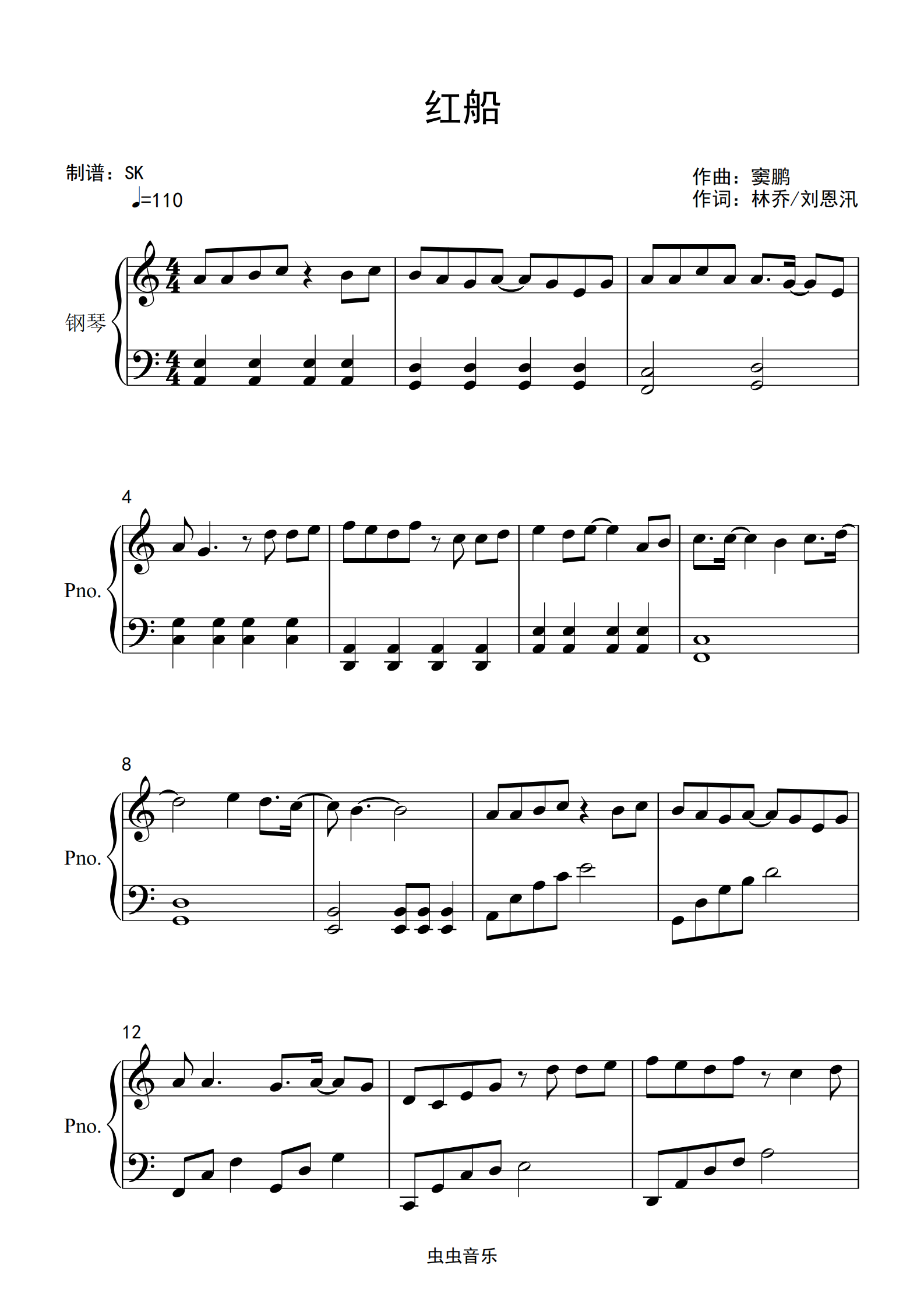 钢琴谱:张哲瀚《红船》入门C调简单版