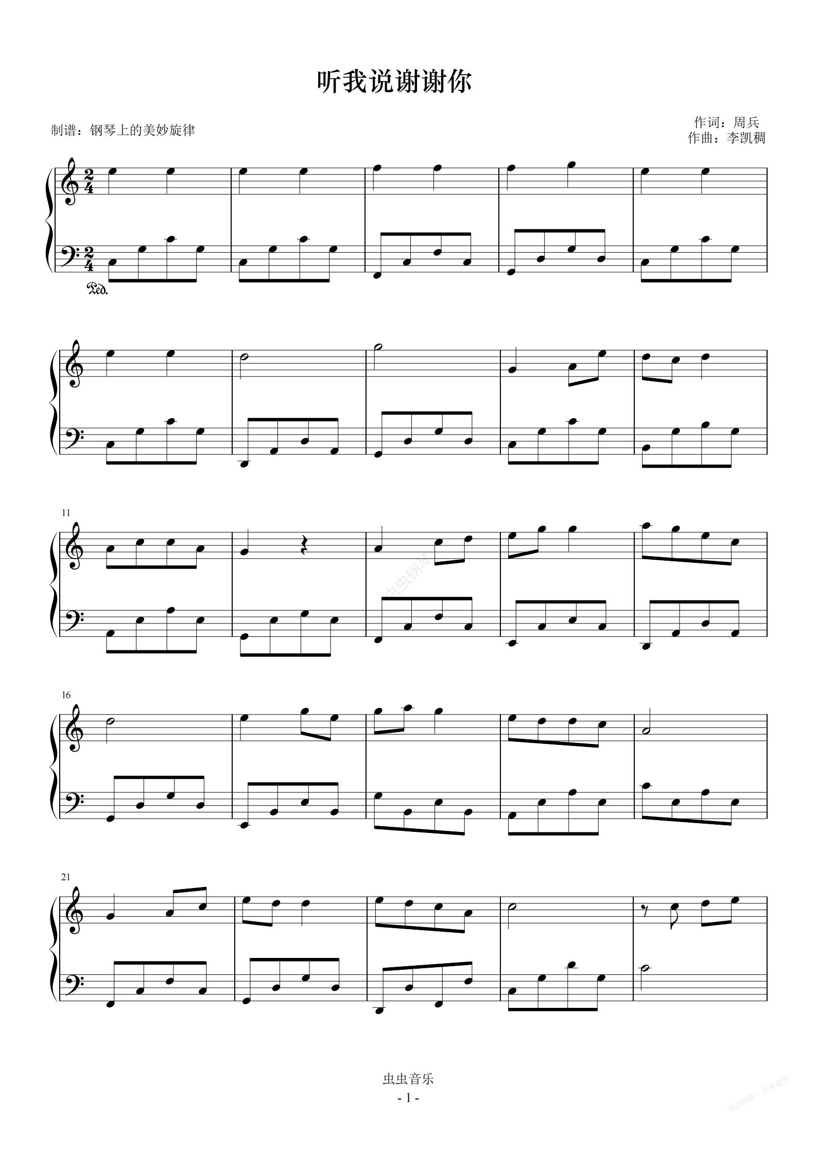 钢琴谱:听我说谢谢你  C调简易版  李昕融