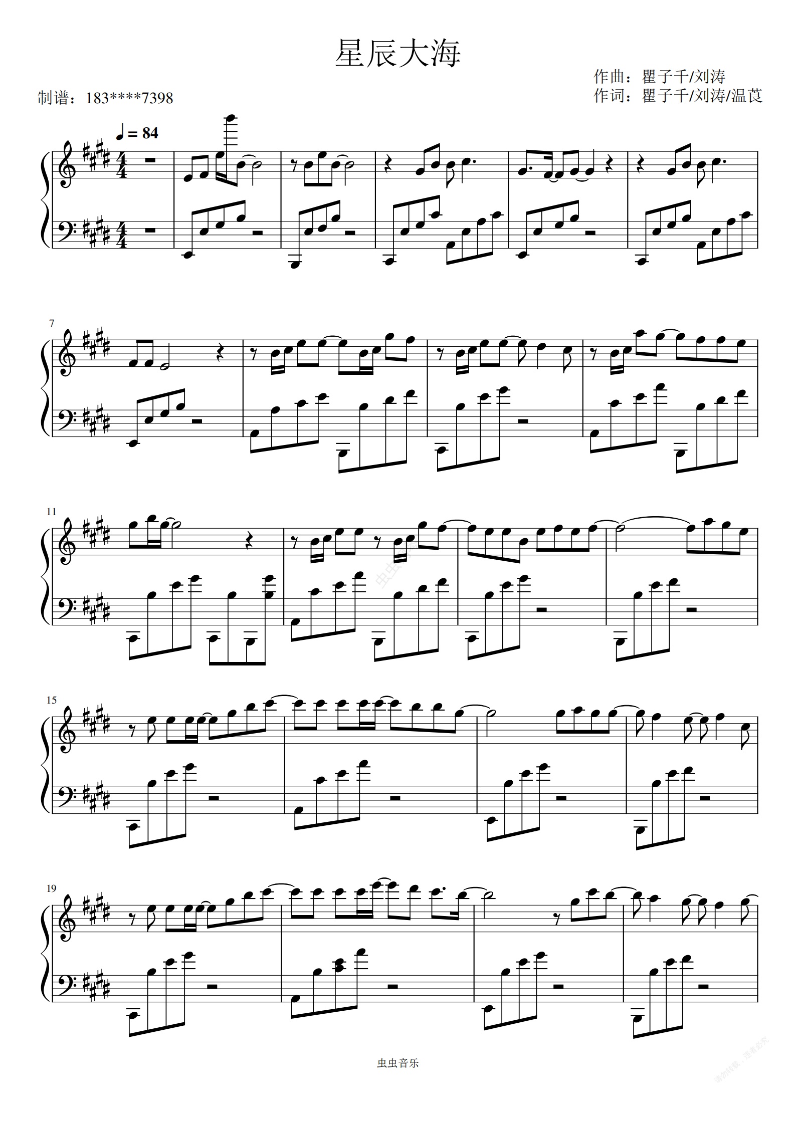 钢琴谱:极限原版-《星辰大海》-E调--啊信改编