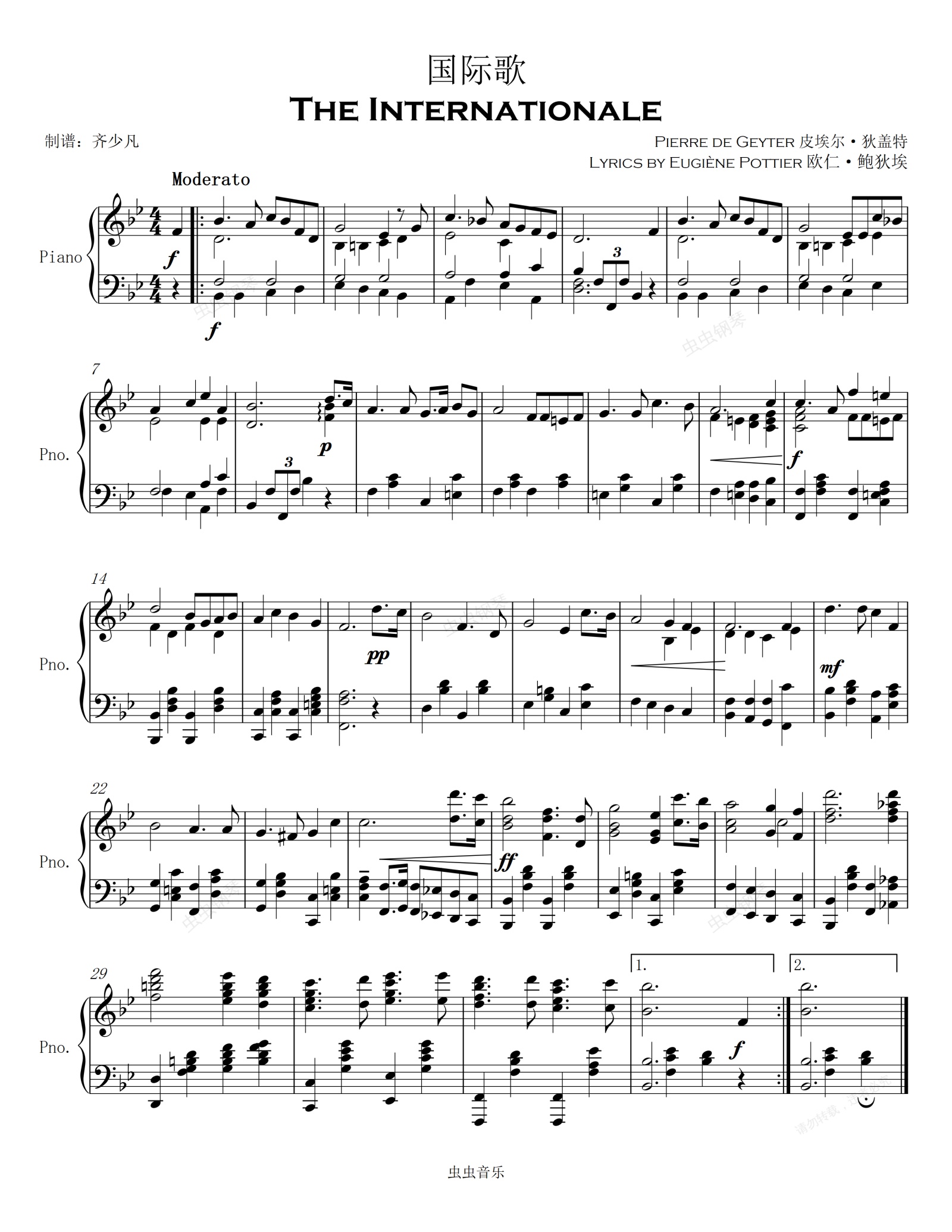 国际歌》(L')是由欧仁·鲍狄埃在1871年作词,皮埃尔·狄盖特于1888年谱曲而成的歌曲。 《国际歌》曾是第一国际和第二国际的会歌 ;20世纪20年代,苏联以《国际歌》为国歌,并在1944年把《国际歌》作为联共(布)党(1952年改名苏联共产党)党歌。 1920年中国首次出现由瞿秋白译成的中文版《国际歌》。1923年由萧三在莫斯科根据俄文转译、由陈乔年配唱的《国际歌》开始在中国传唱。1962年译文重新加以修订。