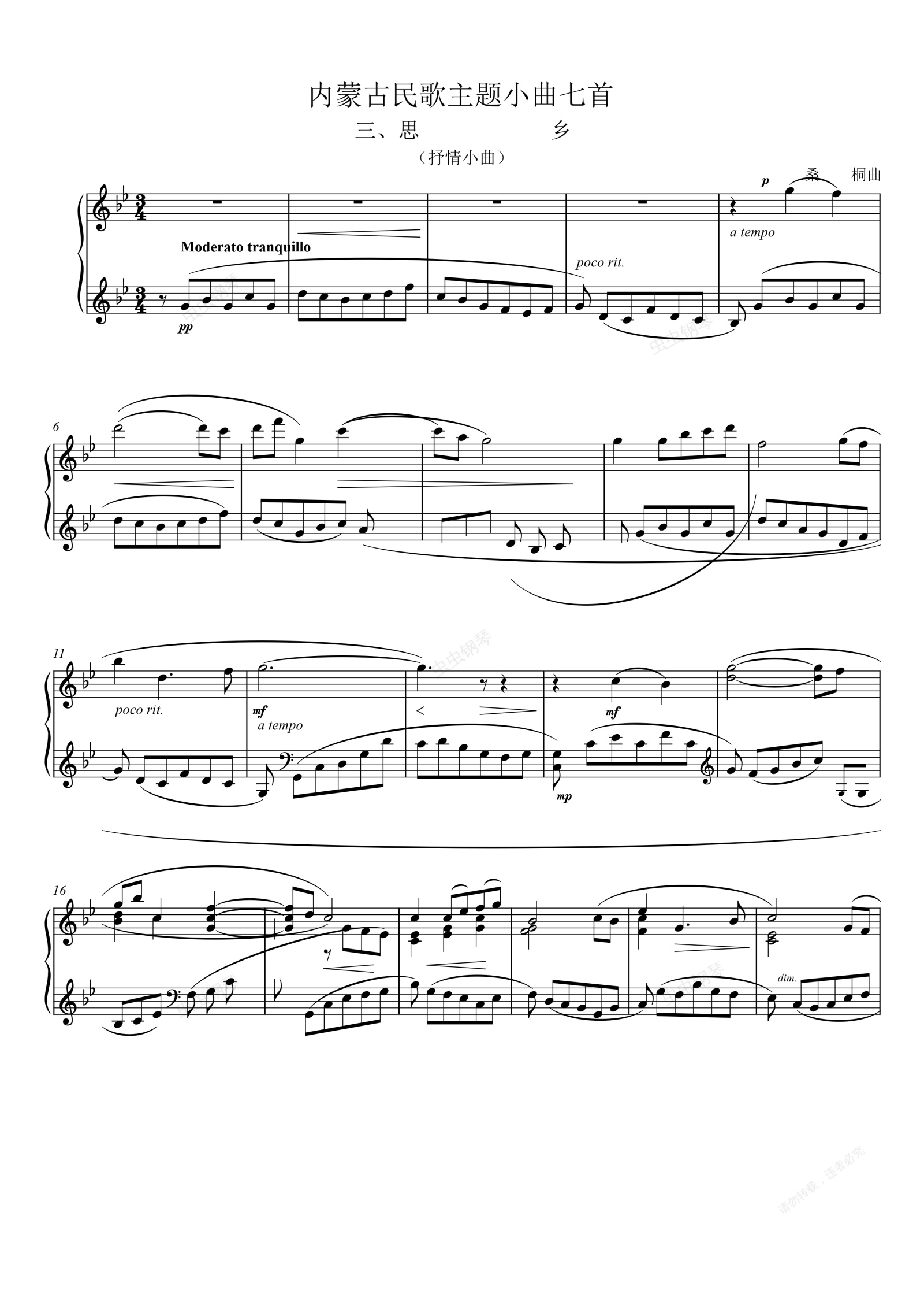 钢琴谱:内蒙古民歌主题小曲七首 三、思乡