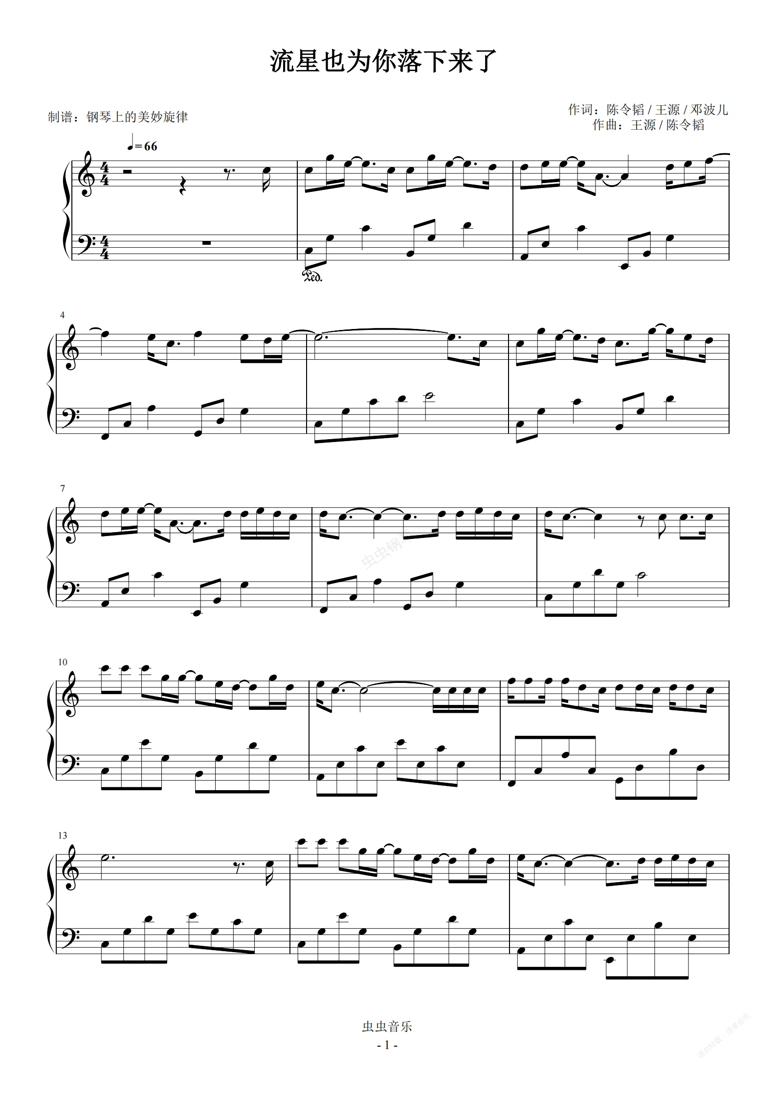 钢琴谱:流星也为你落下来了 C调简易版 王源