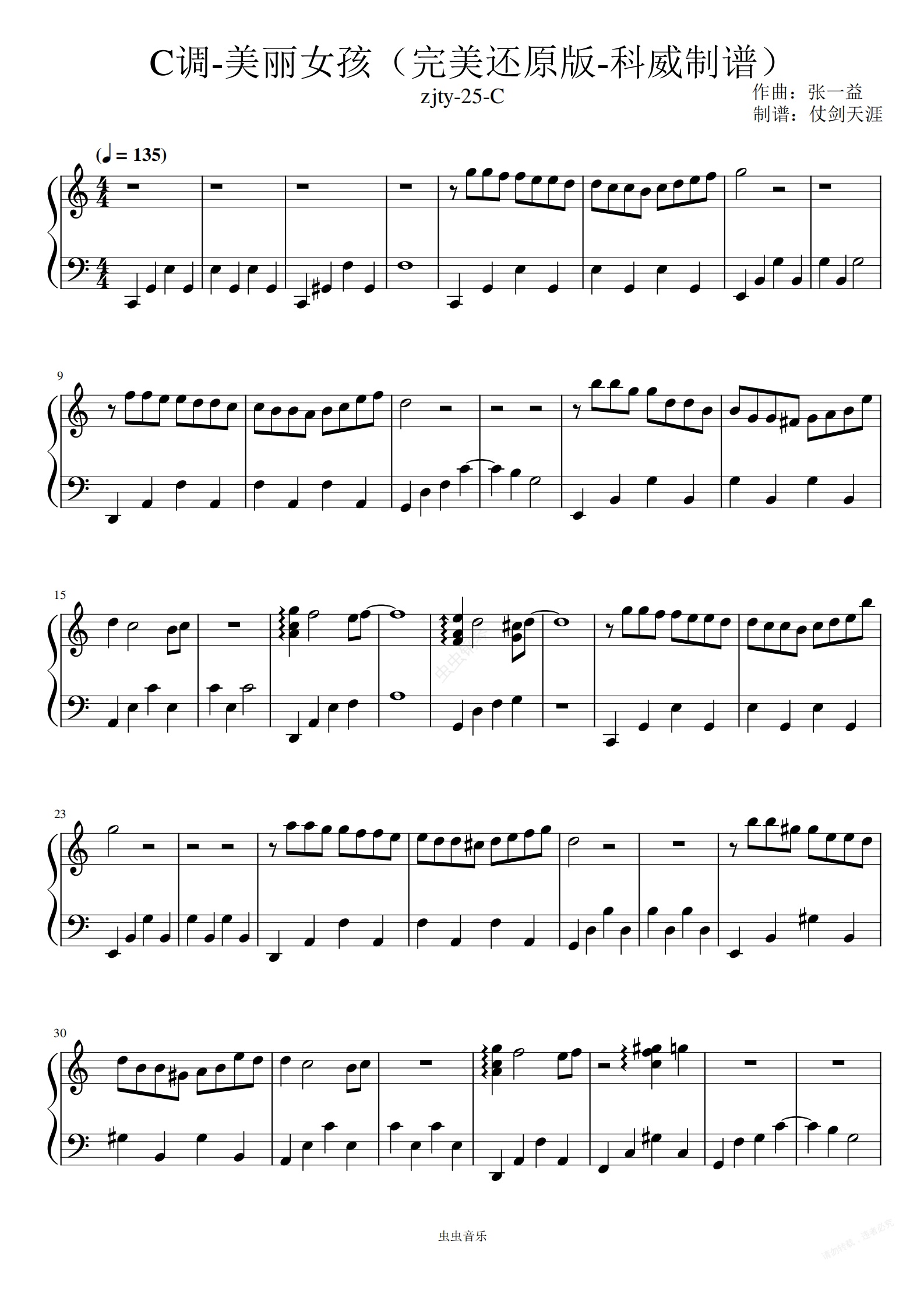钢琴谱:C调-美丽女孩(完美还原版-科威制谱)