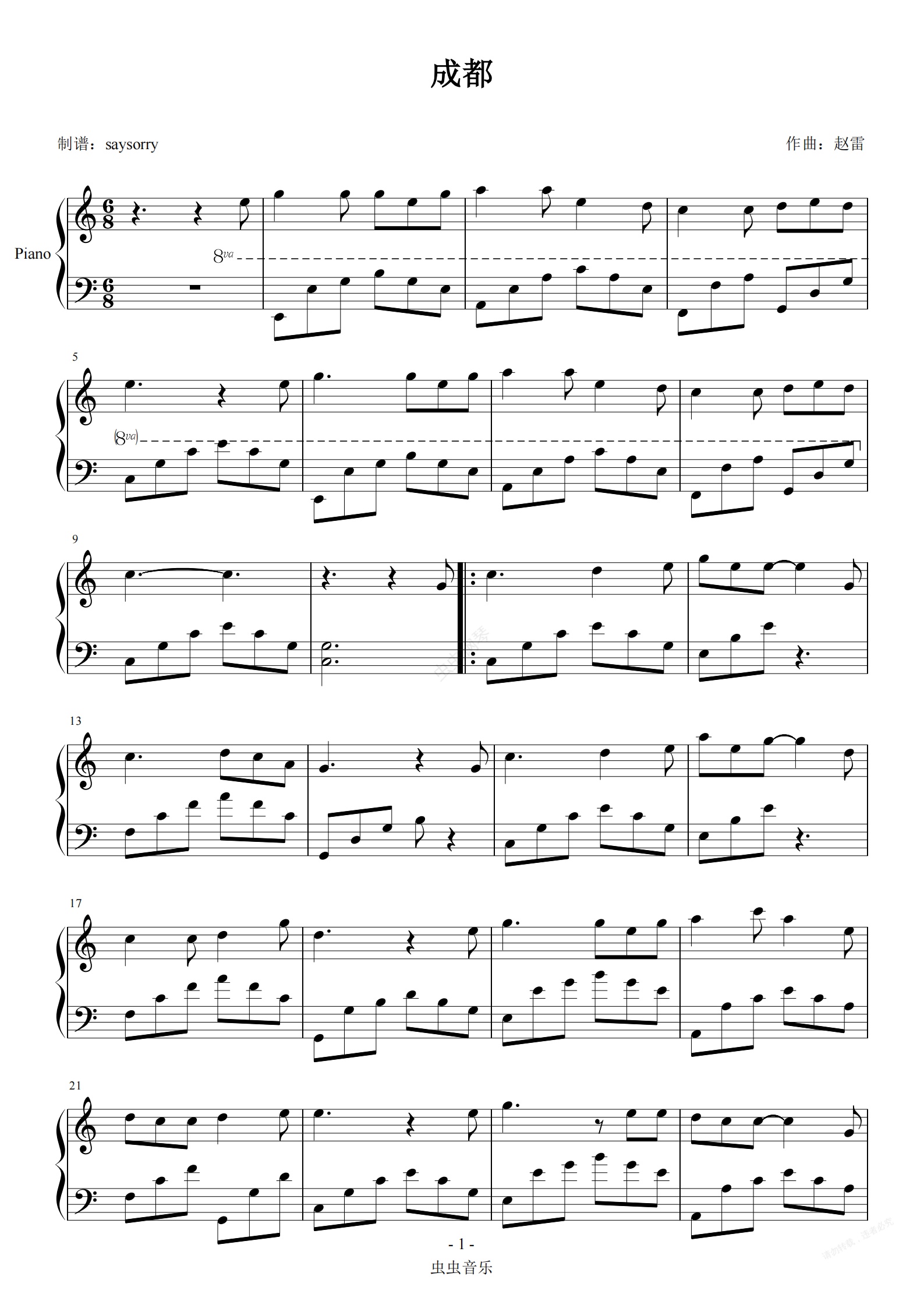 钢琴谱:赵雷《成都》C大调简单好弹