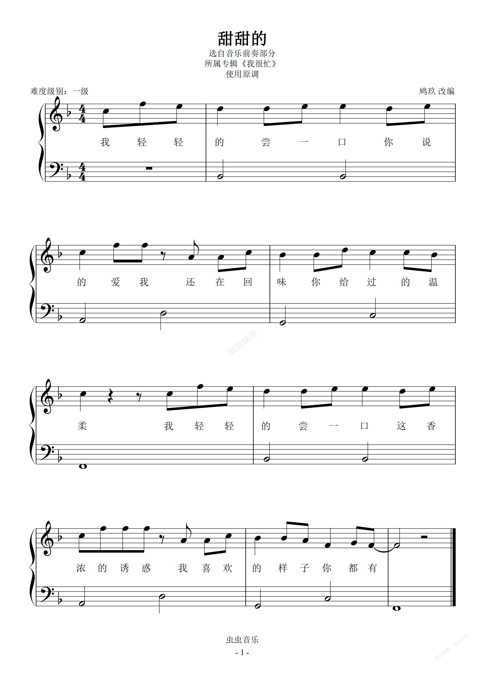 钢琴谱:1-7 甜甜的【组合节奏与一个降号的调号】