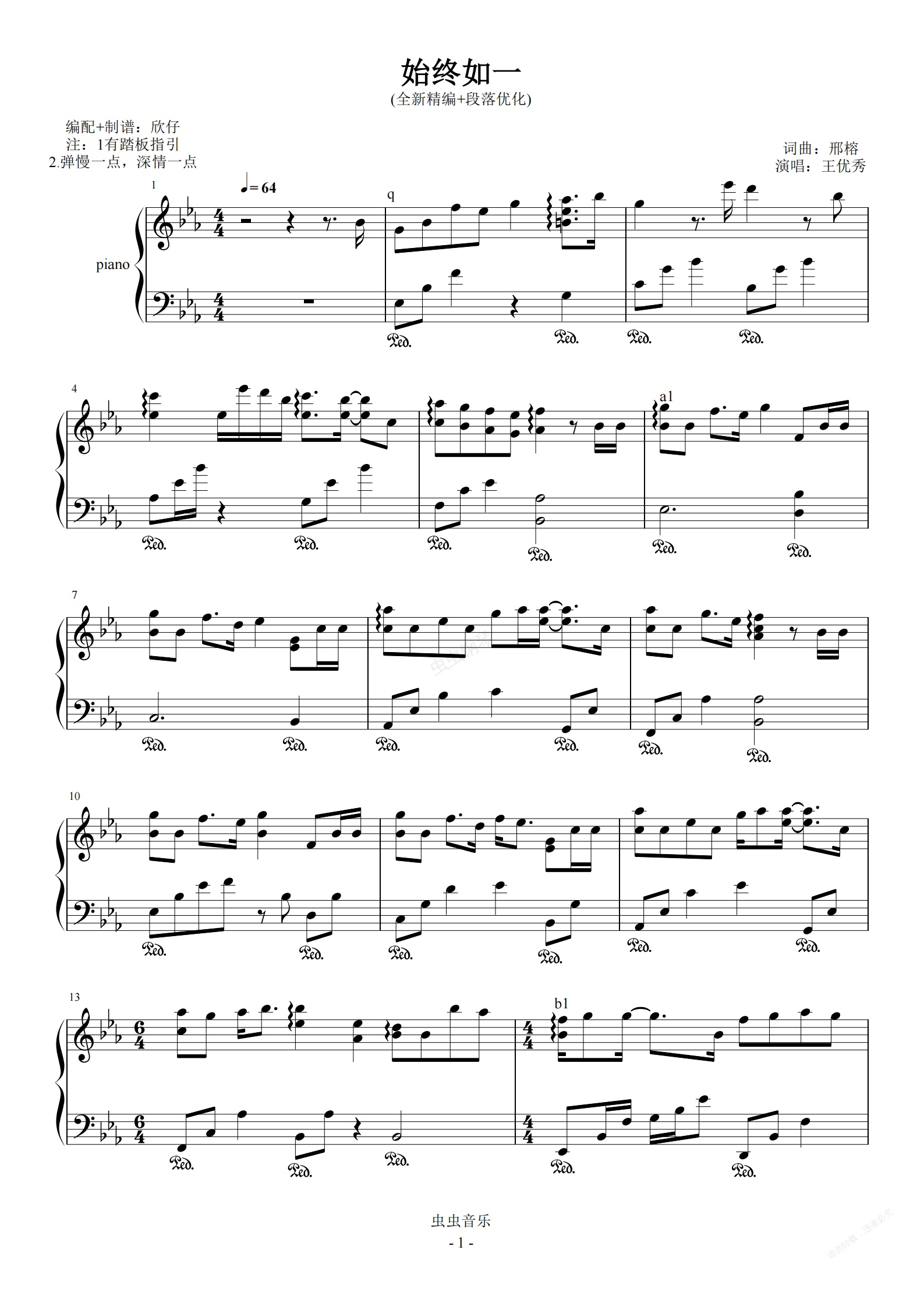 钢琴谱:王优秀-降E《始终如一》(全新精编+段落优化)