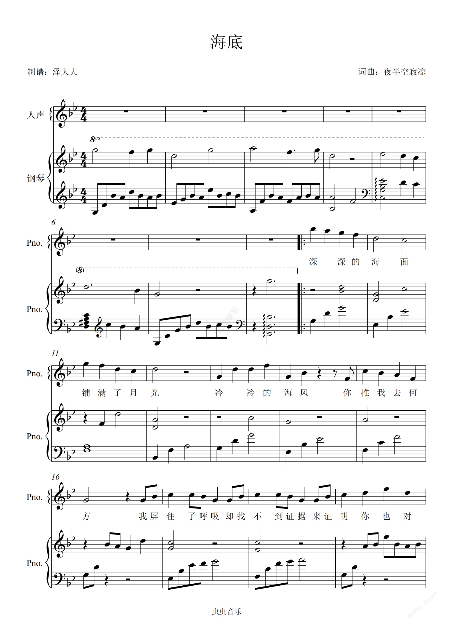 钢琴谱:海底【完美弹唱附词】泽大大 唐千云