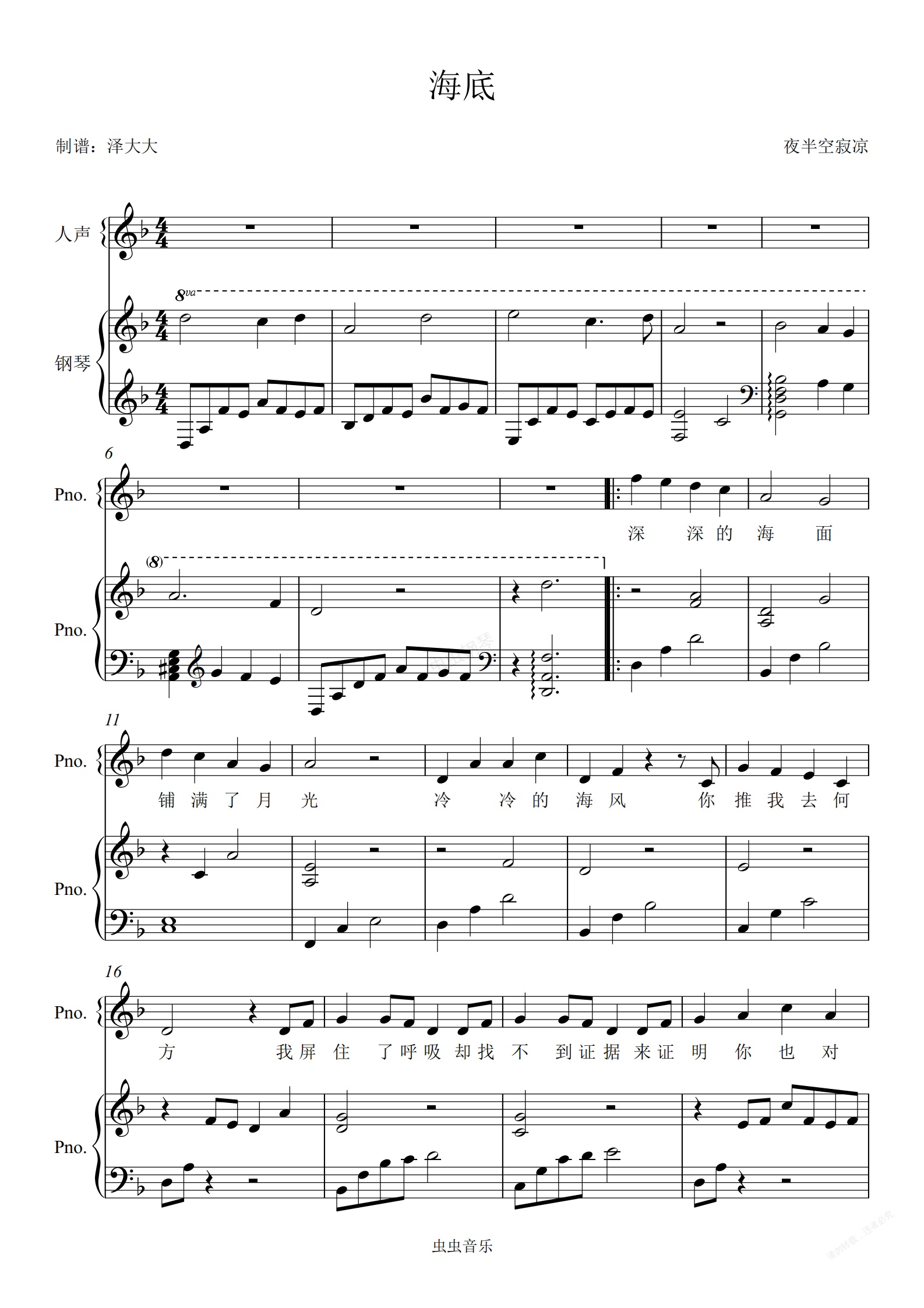 钢琴谱:海底【男生D小调弹唱附词】泽大大 唐千云
