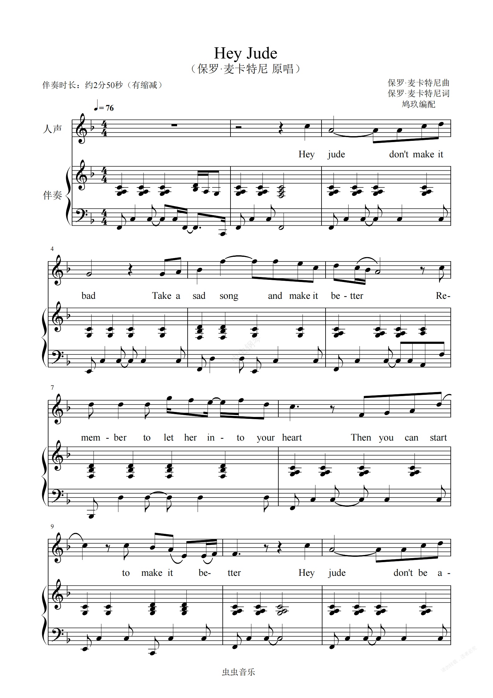 钢琴谱:Hey Jude弹唱谱(伴奏谱)