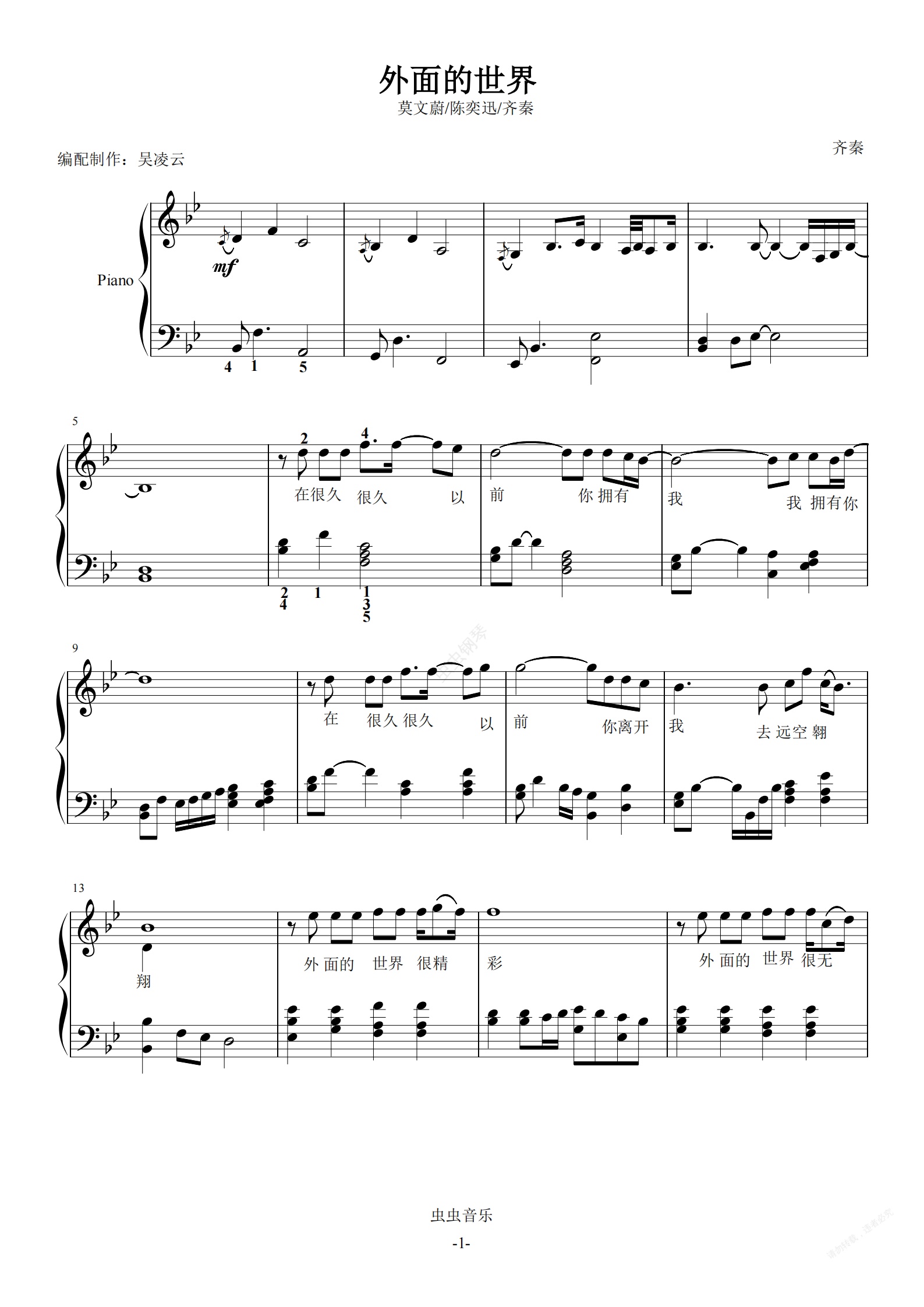 钢琴谱:外面的世界 莫文蔚 吴凌云精致实用付歌词带指法钢琴演奏版 演唱莫文蔚/齐秦/陈奕迅