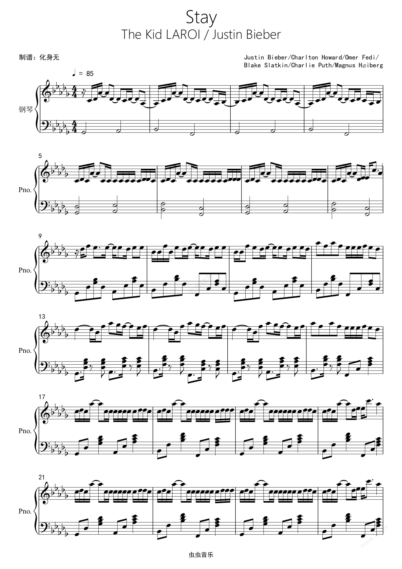 钢琴谱:Stay - Justin Bieber / The Kid LAROI 原调独奏版