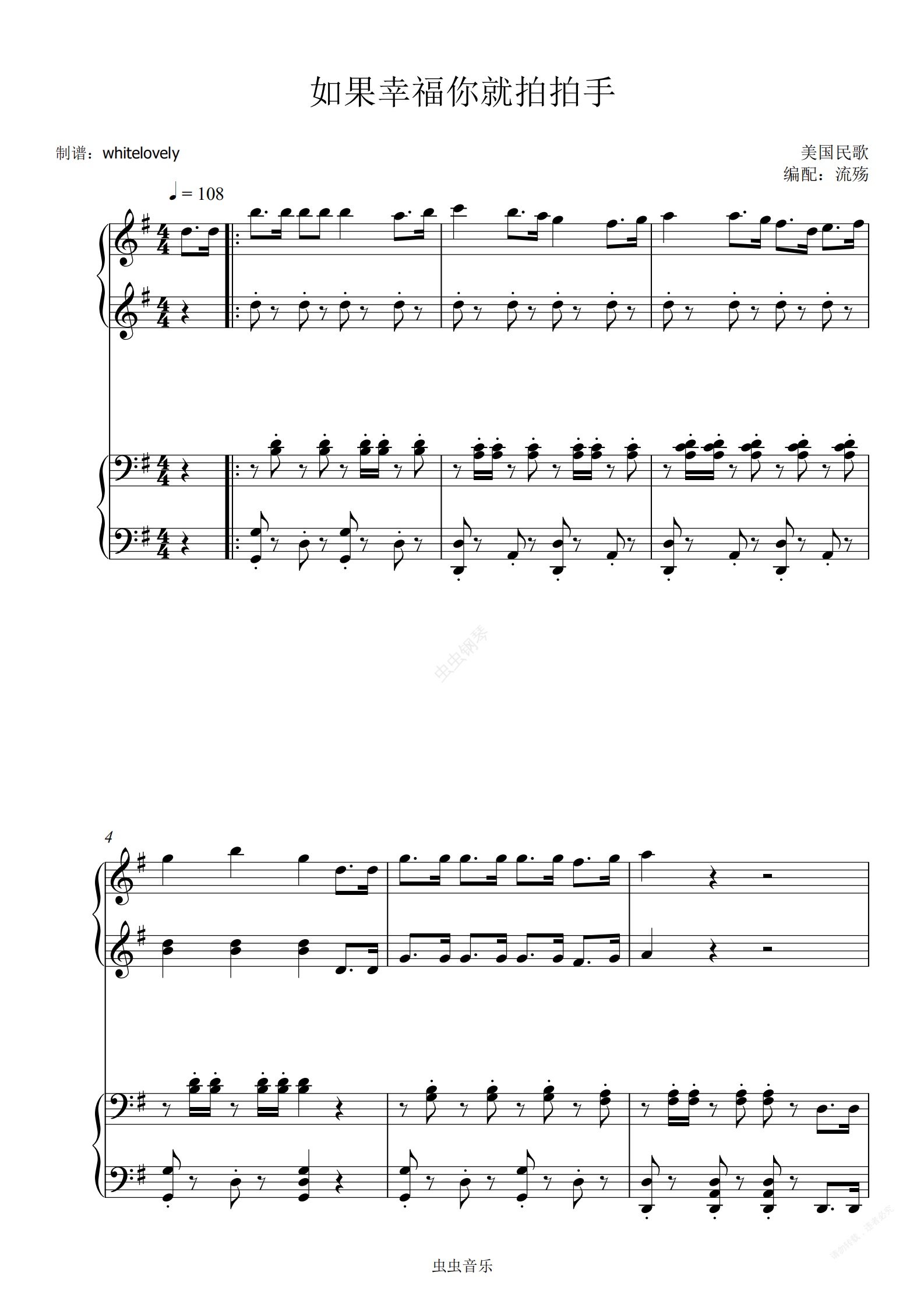 钢琴谱:如果幸福你就拍拍手 G调四手联弹