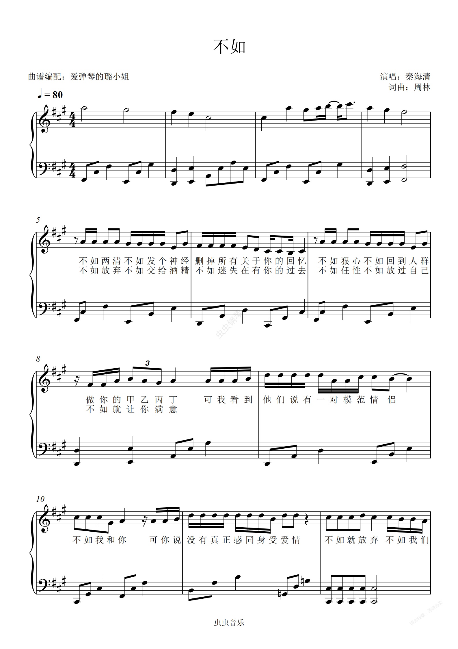 钢琴谱:不如 - A调原调易学简单版 - 抖音热歌 - 附歌词