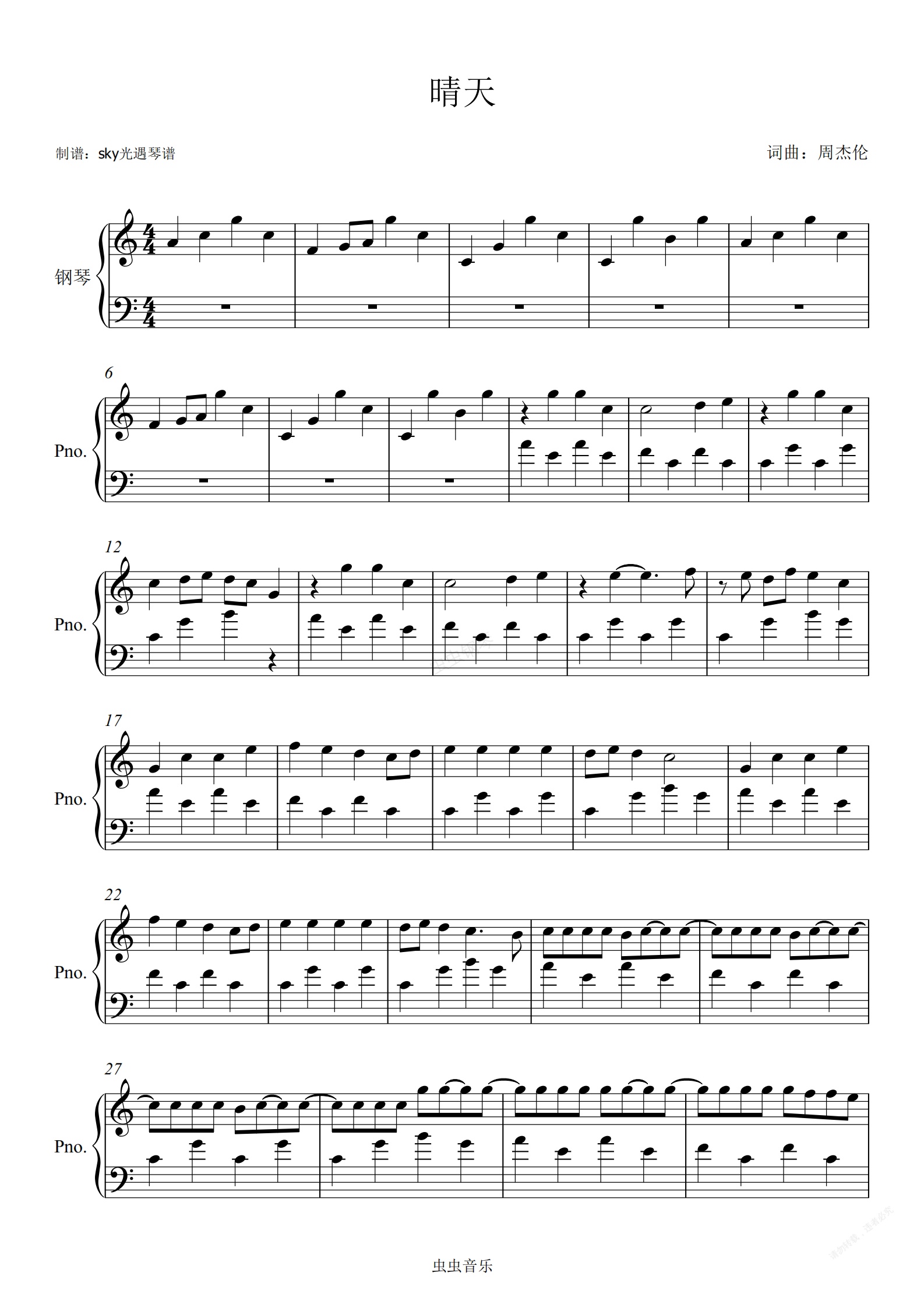 钢琴谱:晴天-周杰伦(sky光遇琴谱)