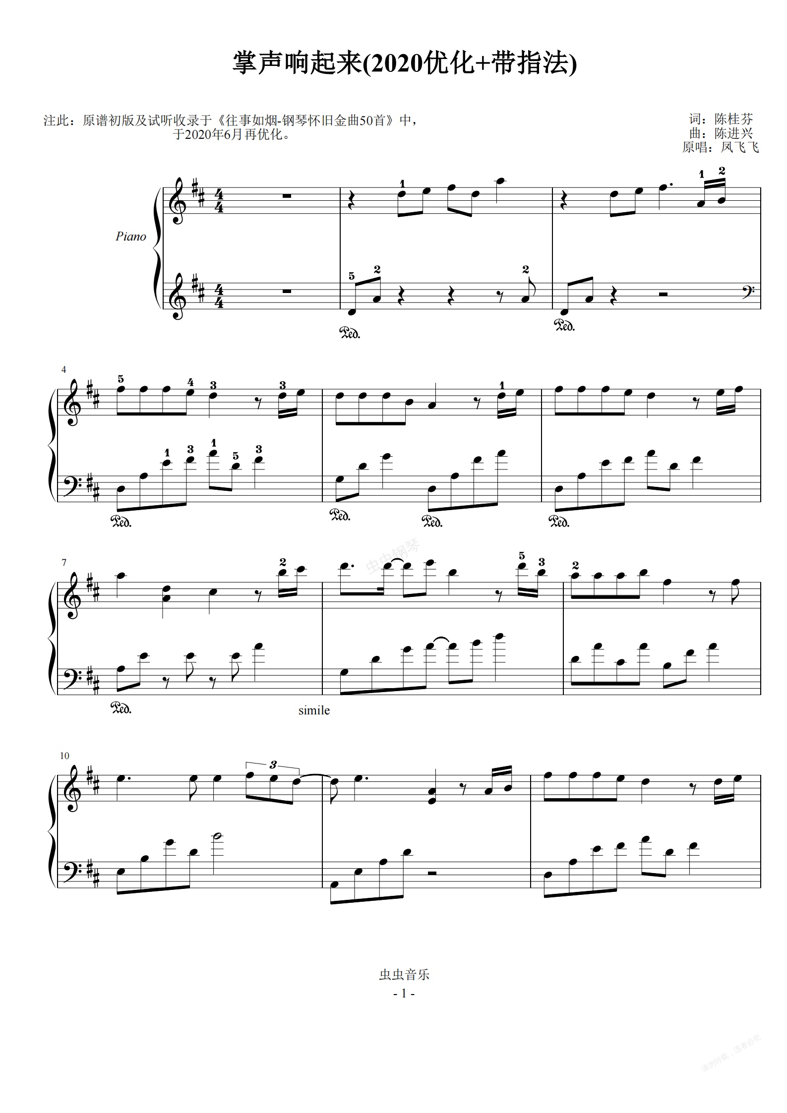 钢琴谱:凤飞飞-D《掌声响起来》(段落优化+指法)