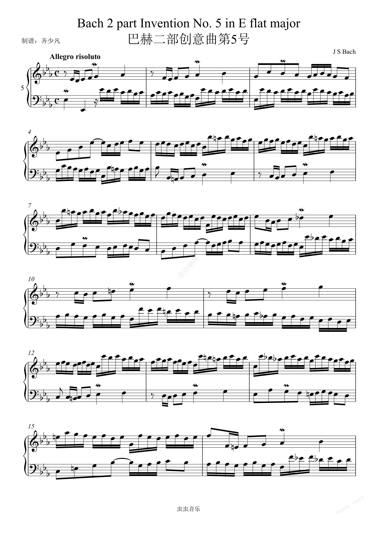 钢琴谱:第五号巴赫二部创意曲降E大调