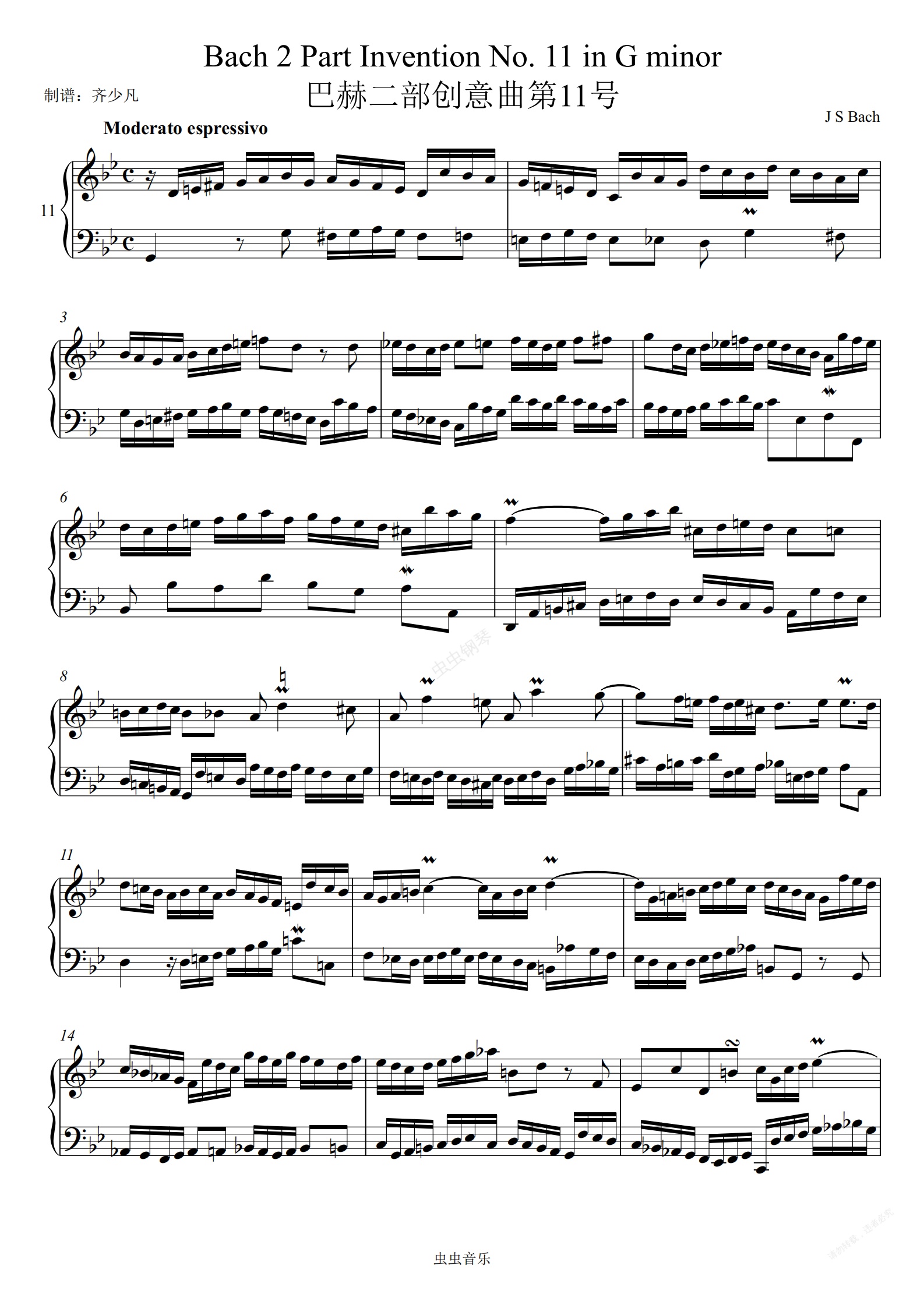 钢琴谱:第十一号巴赫二部创意曲G小调
