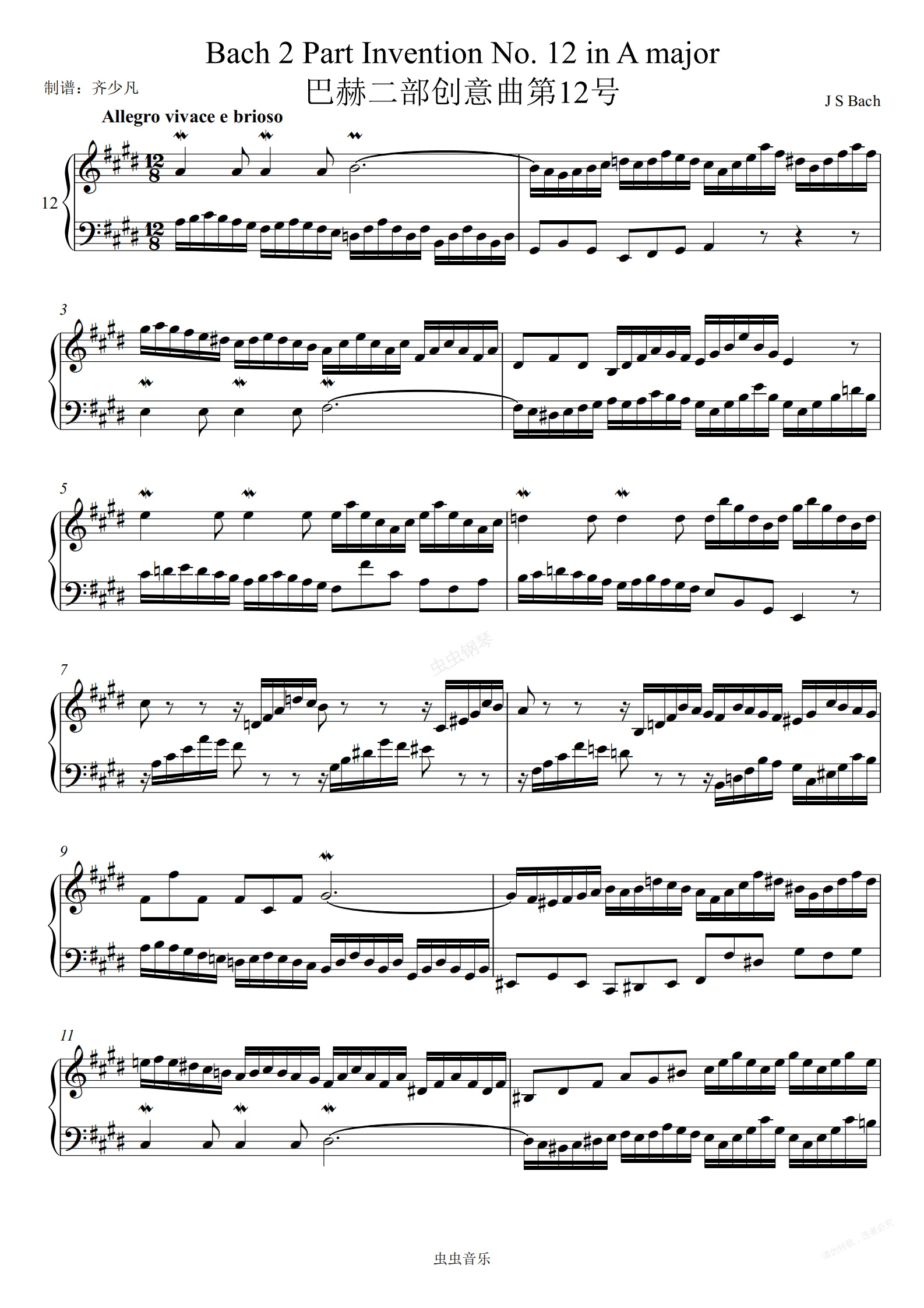 钢琴谱:第十二号巴赫二部创意曲A大调