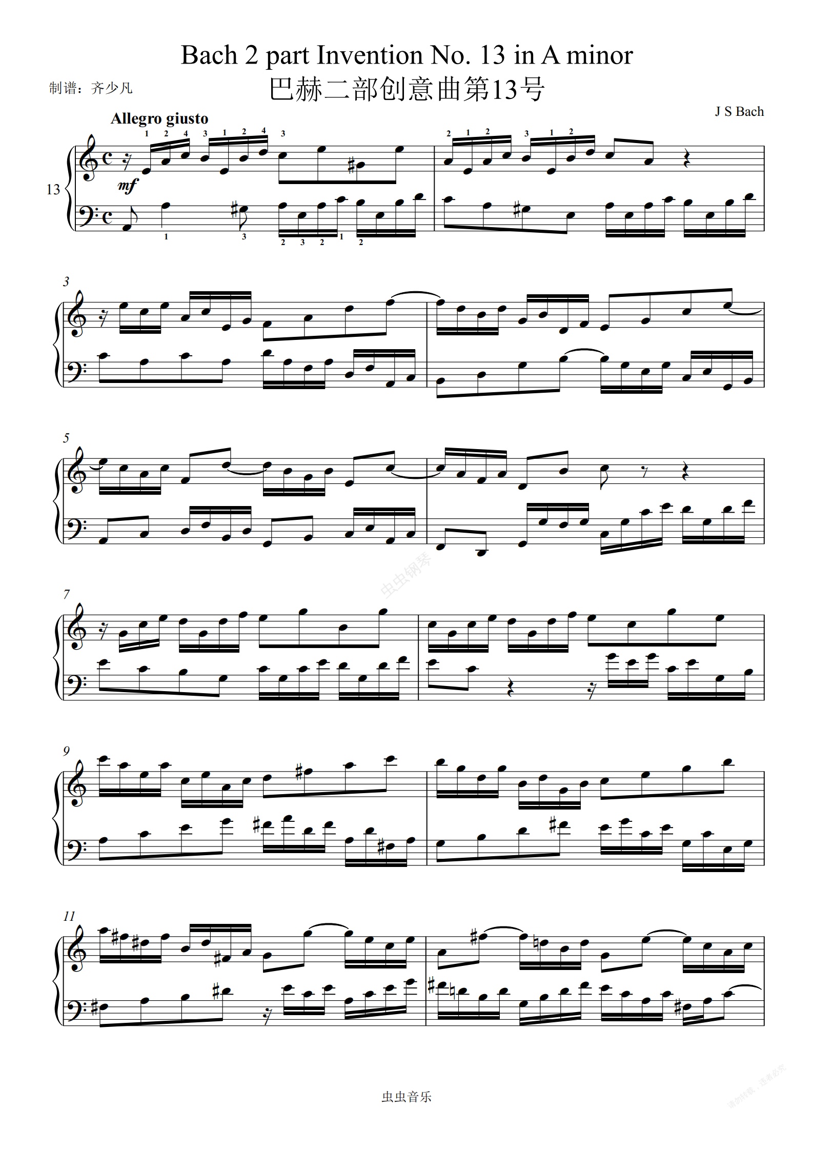 钢琴谱:第十三号巴赫二部创意曲A小调