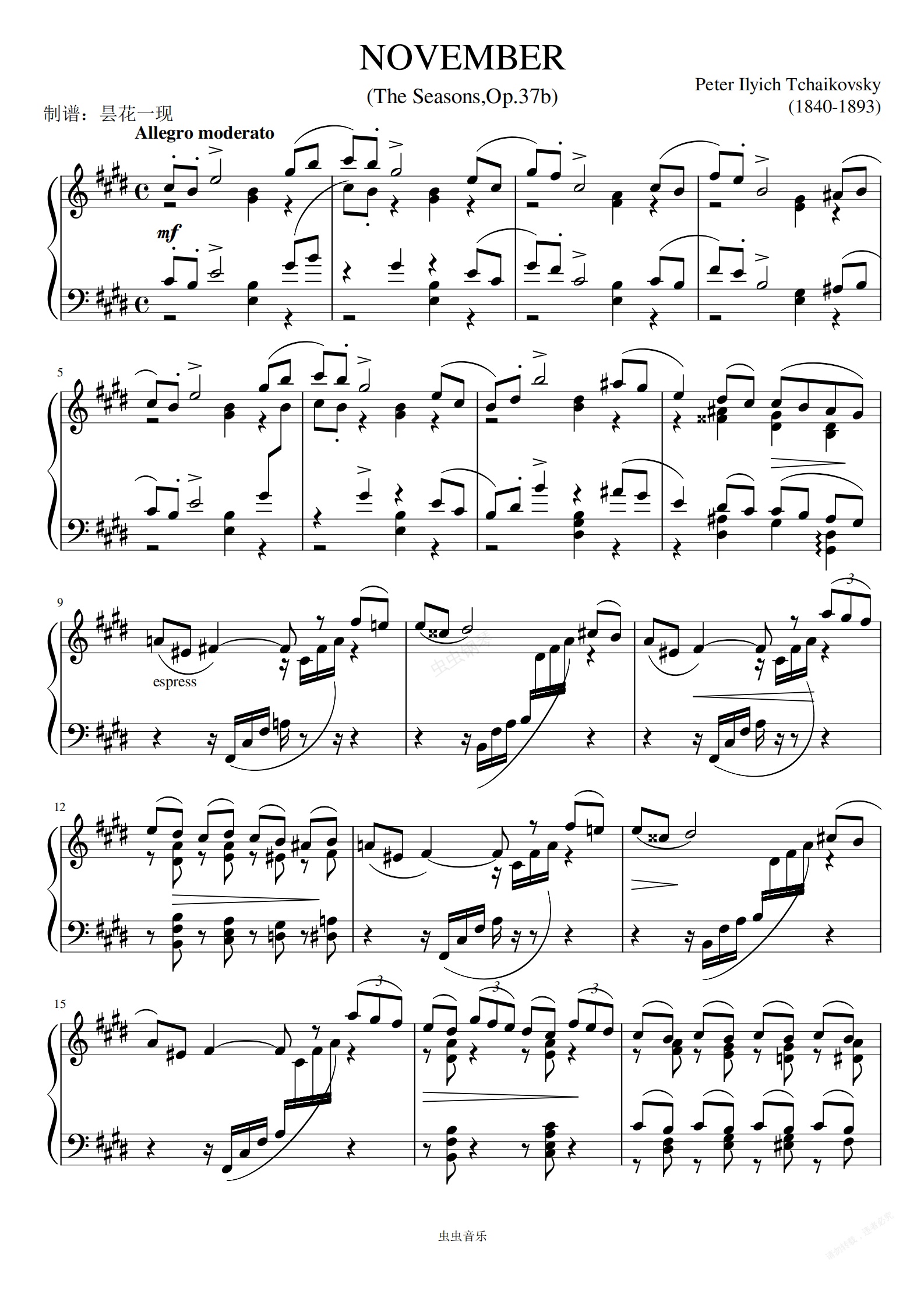 钢琴谱:十一月-雪橇《四季》柴可夫斯基
