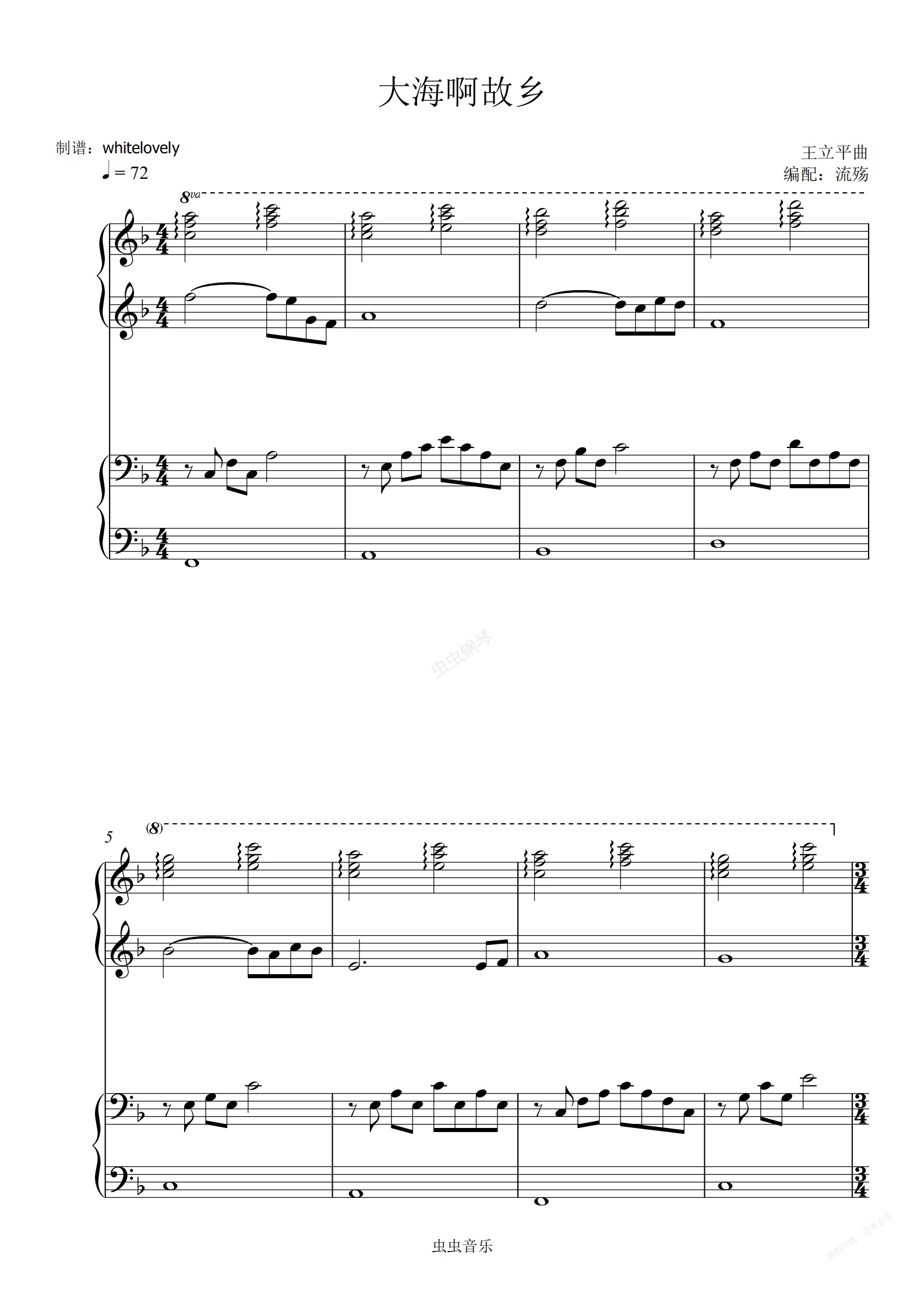 钢琴谱:大海啊故乡 F调简易四手联弹