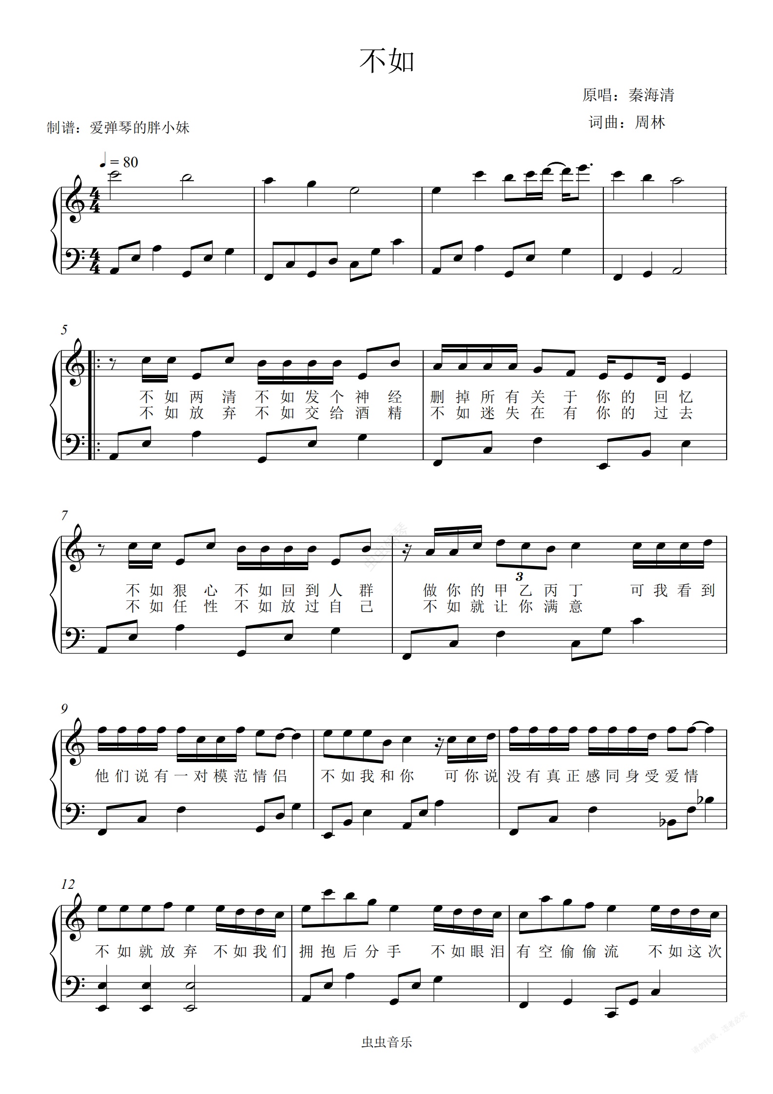 钢琴谱:《不如》C调初学者完整版配歌词