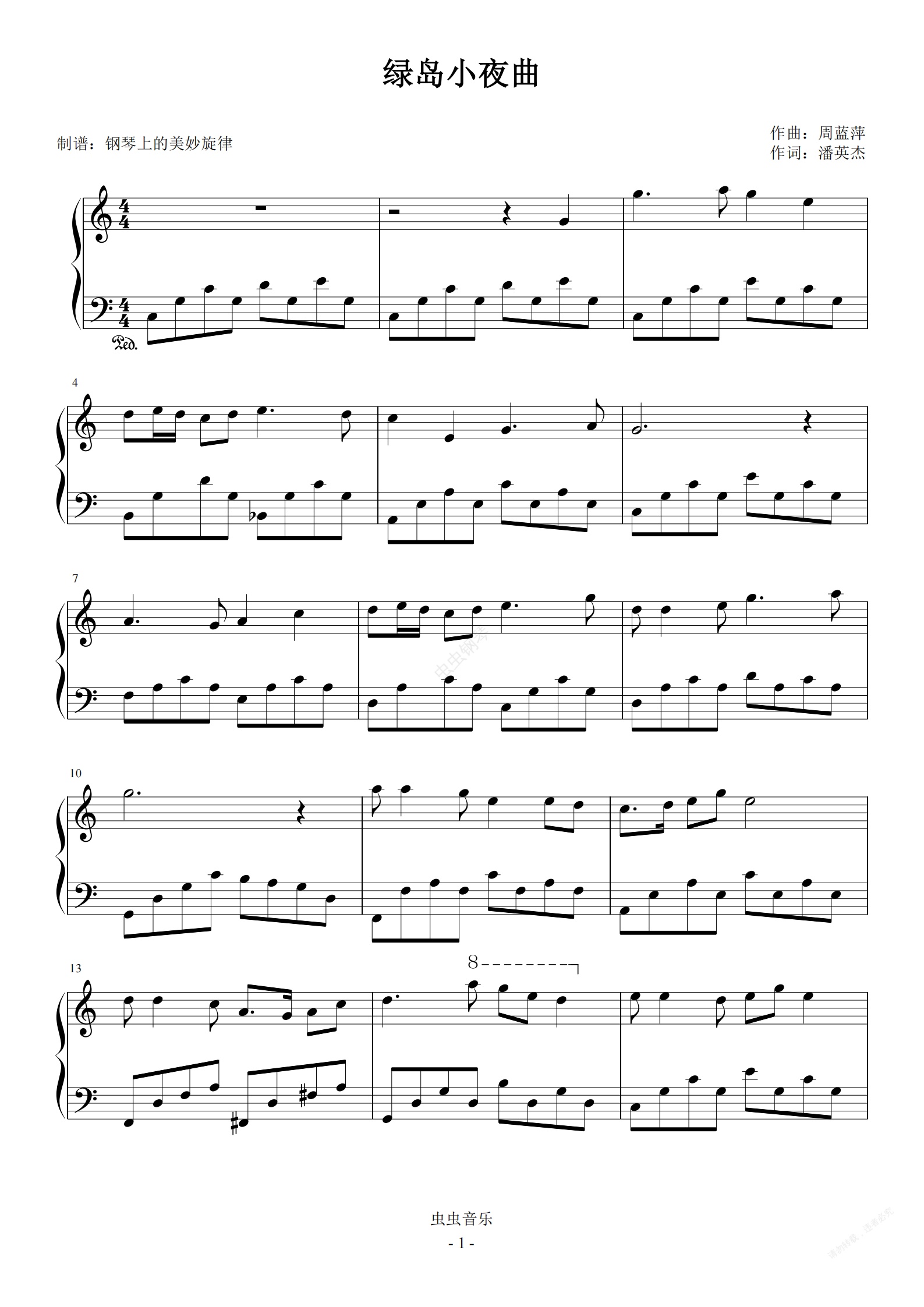 钢琴谱:绿岛小夜曲 友谊之光 C调简易版