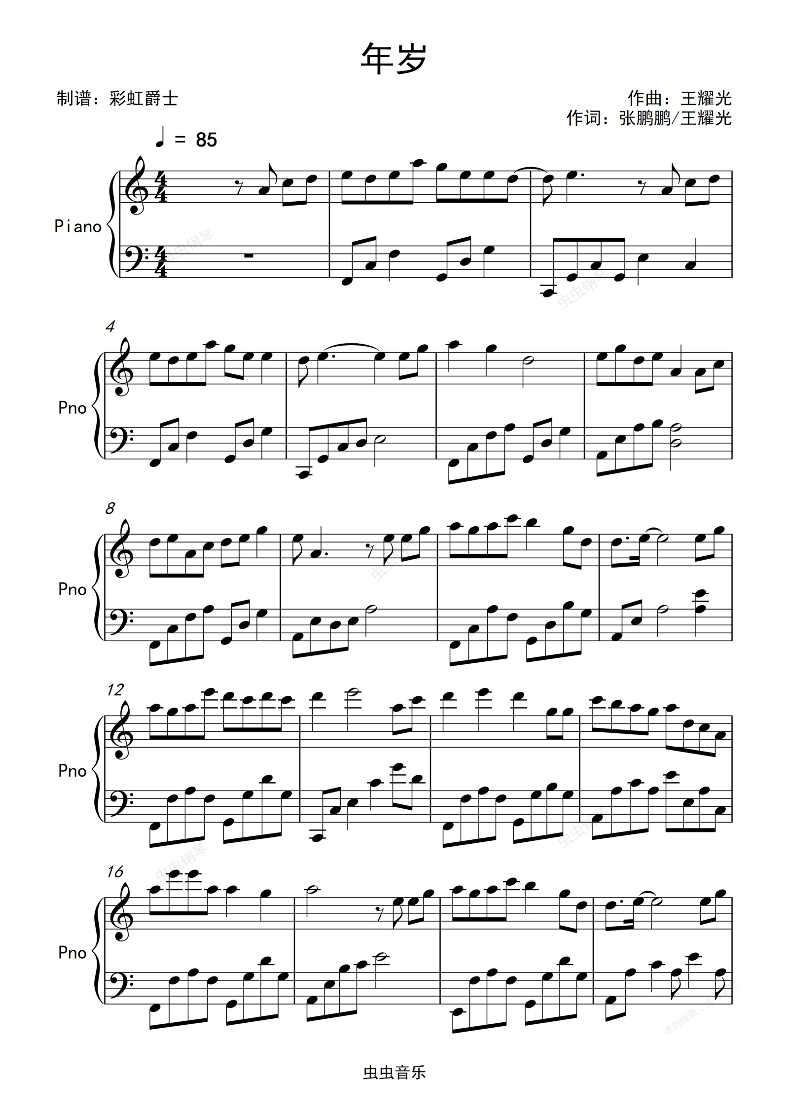 钢琴谱:年岁 毛不易 钢琴 简谱 C 调简单版