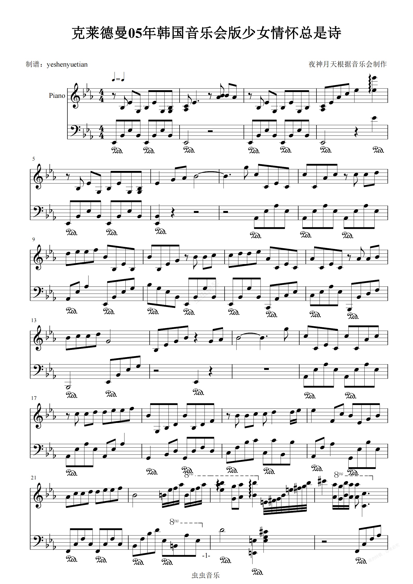钢琴谱:克莱德曼少女情怀总是诗(Bilitis)live音乐会版
