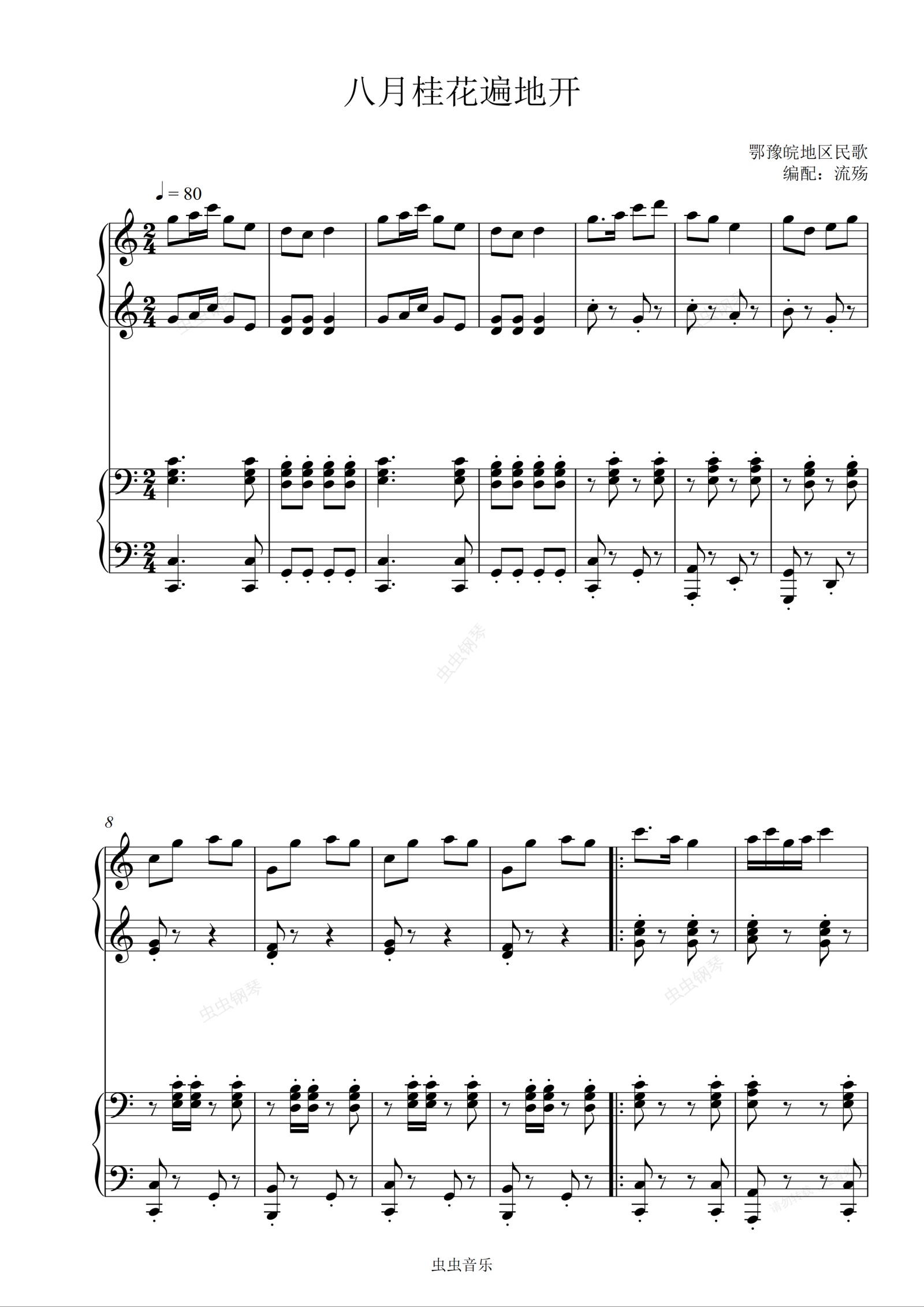 钢琴谱:八月桂花遍地开 C调简易四手联弹