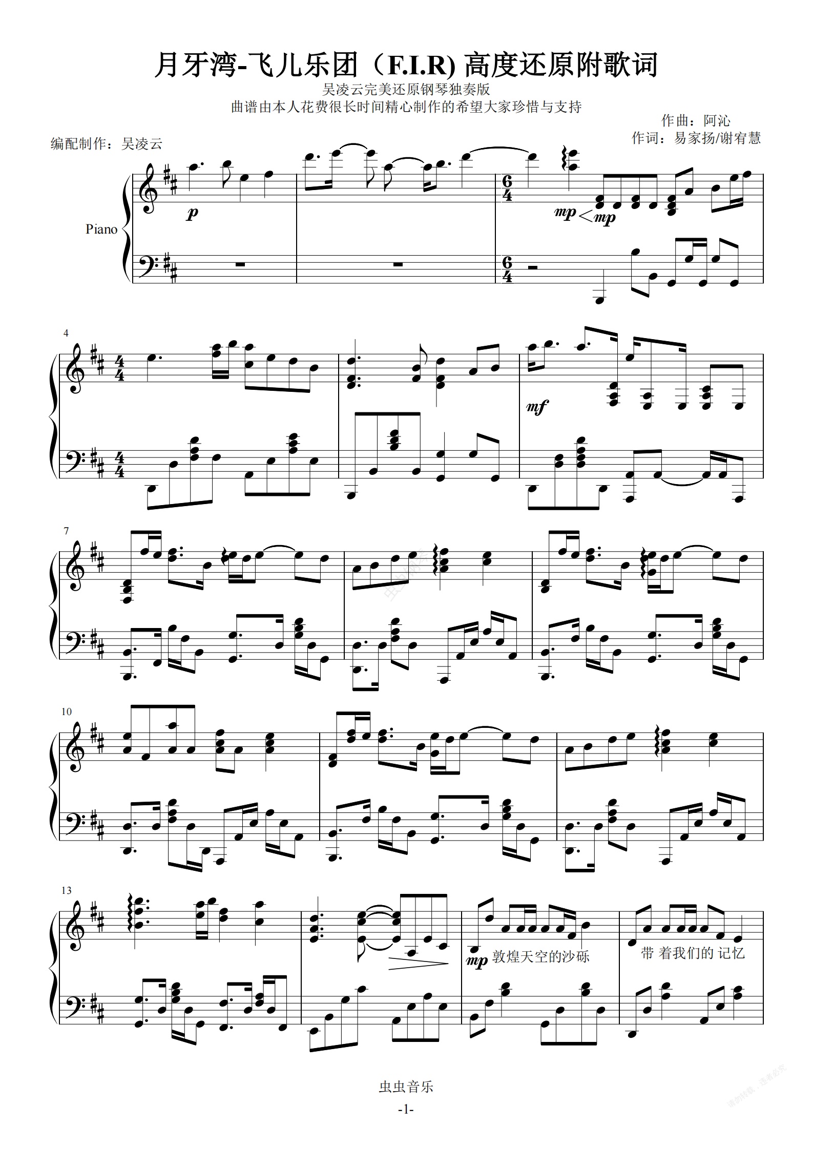 钢琴谱:月牙湾-飞儿乐团(F.I.R) 高度还原附歌词 吴凌云完美还原钢琴独奏版