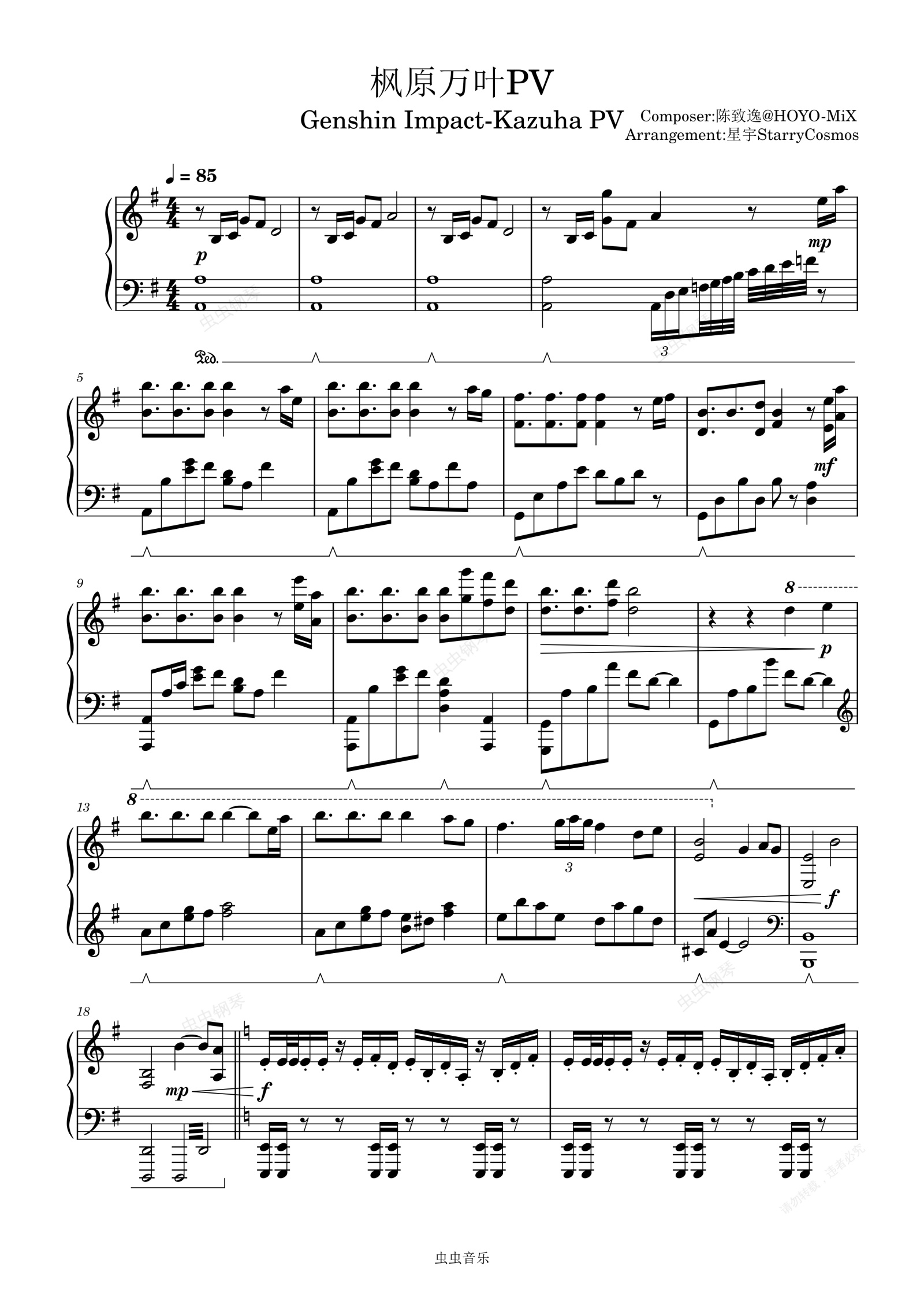 枫原万叶让我喜欢浪人武士这种人设,风元素和枫叶有着独有的关联,就像秋天一阵风的感觉,抽了50发,全被万叶躲开了,大保底留给神里了。这次改编参考了油管上面一位ACG改编大佬 - Anime Piano,增加了一部分装饰音和修改了部分音符。难点和细节教程:1.第四小节的音阶特意改成了C大调音阶,力度控制尽量轻,踩3/5的踏板确保音符不会浑浊。2.第五小节到第十一小节,左手的大跳需要放松下来保持弧度的跳跃。3.第19小节(还原记号)到22小节,右手需要跳音,左手就像打鼓一样拍几下,注意好节奏,尽量先练右手再去和左手对节奏,八度弹不来或者不准可以去练习下哈农的八度音阶。4.第23小节到25小节,先慢练右手再慢练左手,跟着节拍器或者感觉来对节奏。