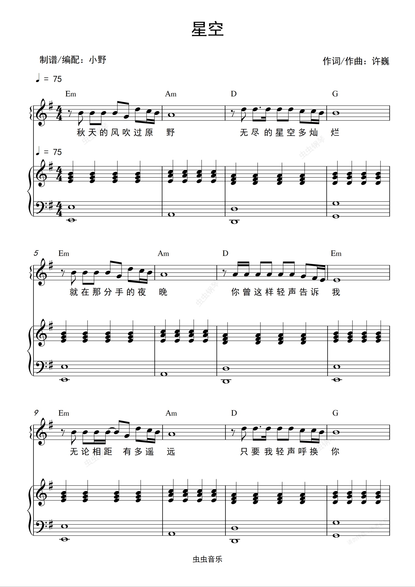 钢琴谱:星空(和弦弹唱版)