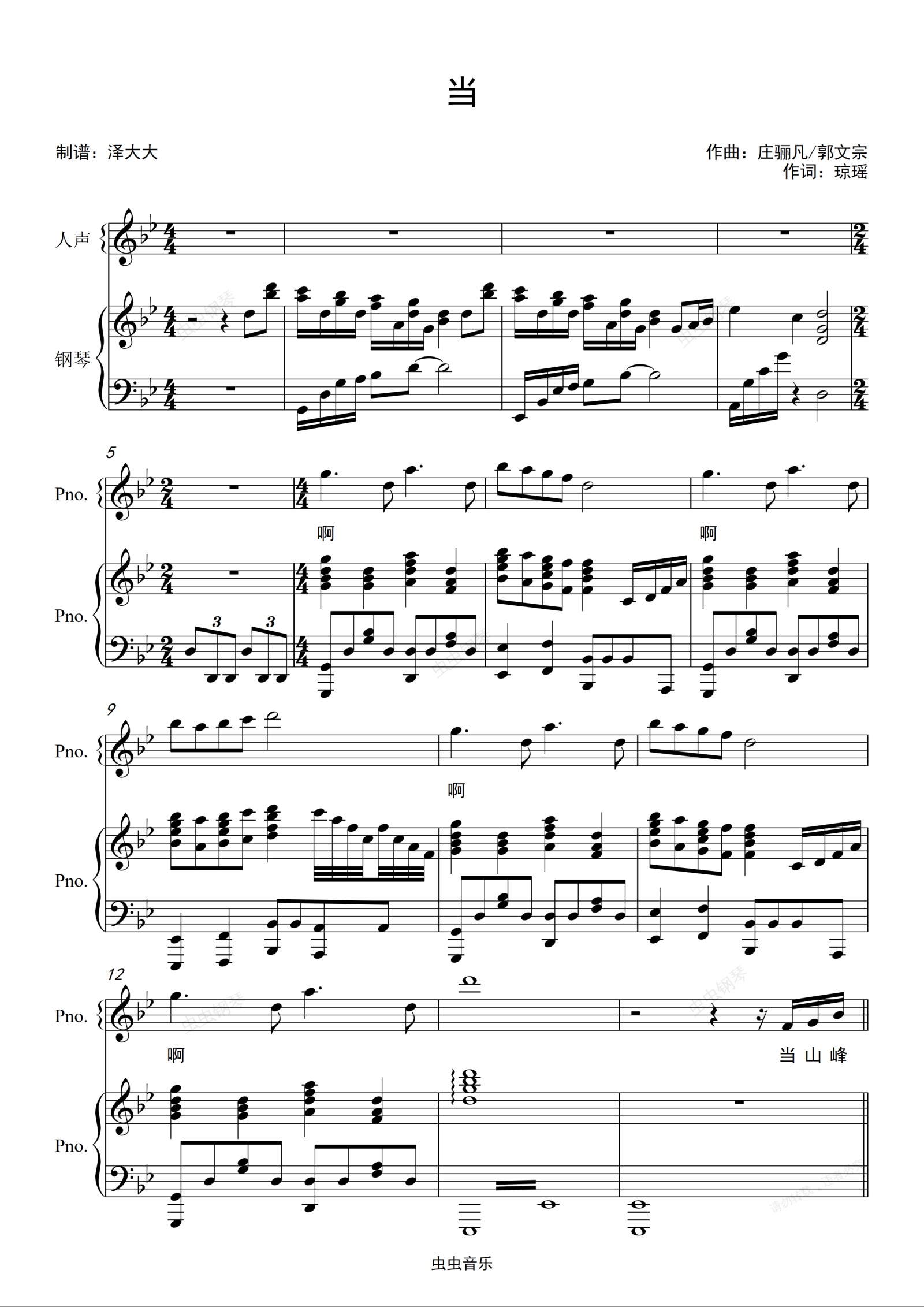 钢琴谱:当【女生版弹唱附词】泽大大 动力火车