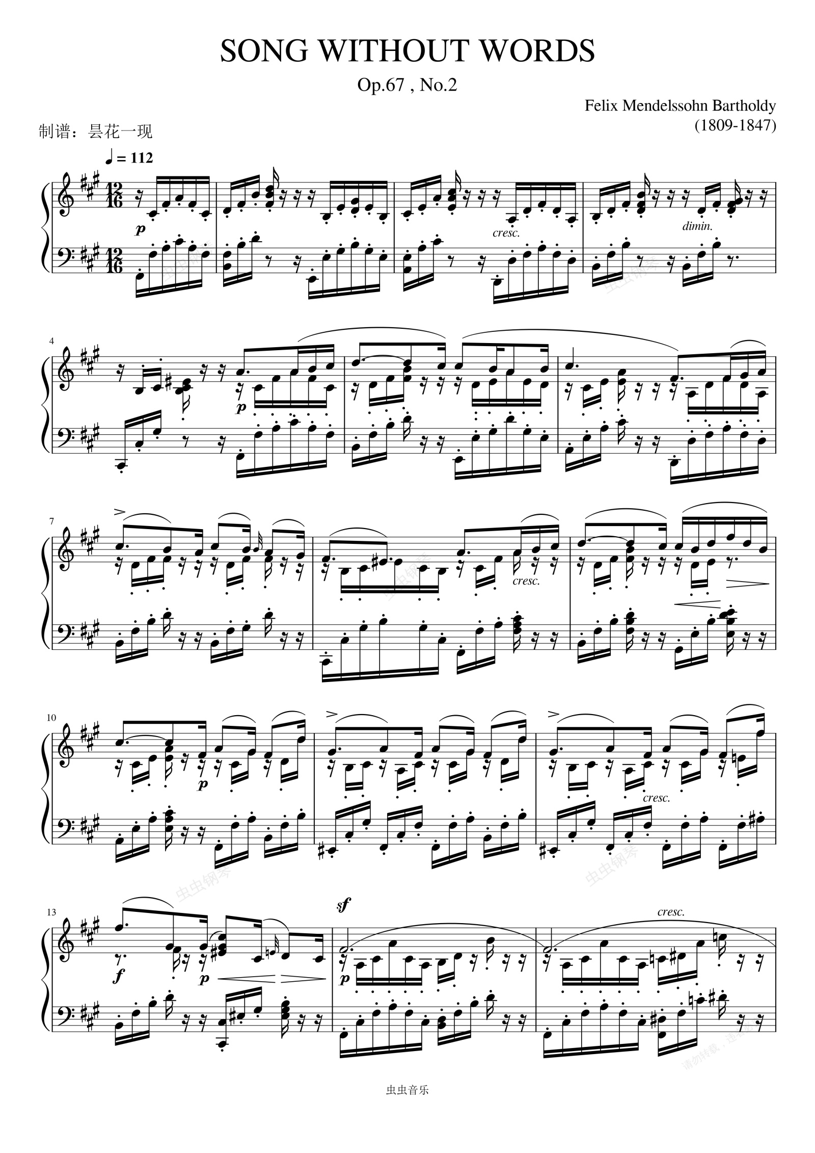 钢琴谱:失去的幻影 - 无词歌 Op.67 , No.2 门德尔松