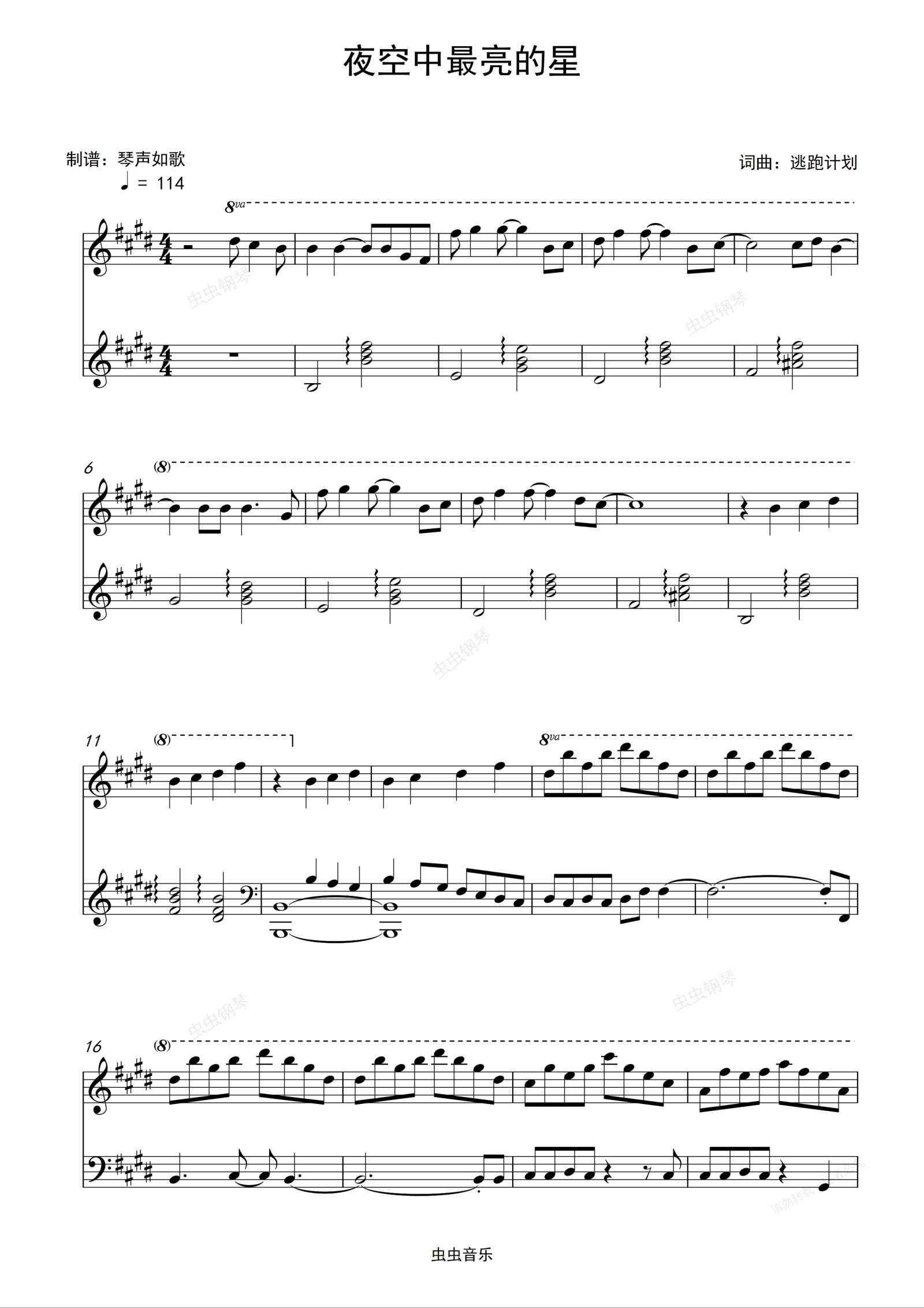 钢琴谱:夜空中最亮的星-好听易弹