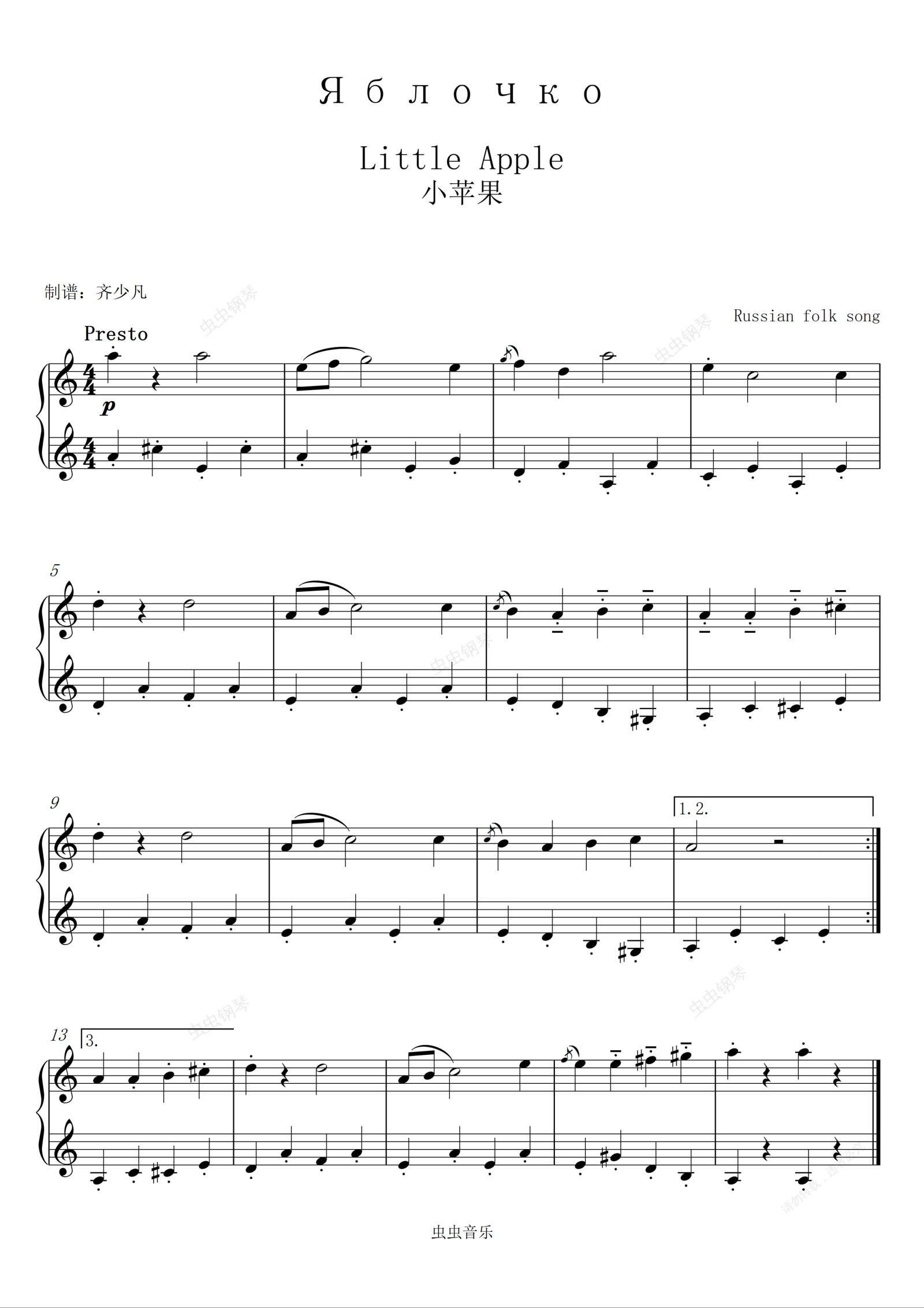 钢琴谱:【初学者】小苹果-俄罗斯水手舞