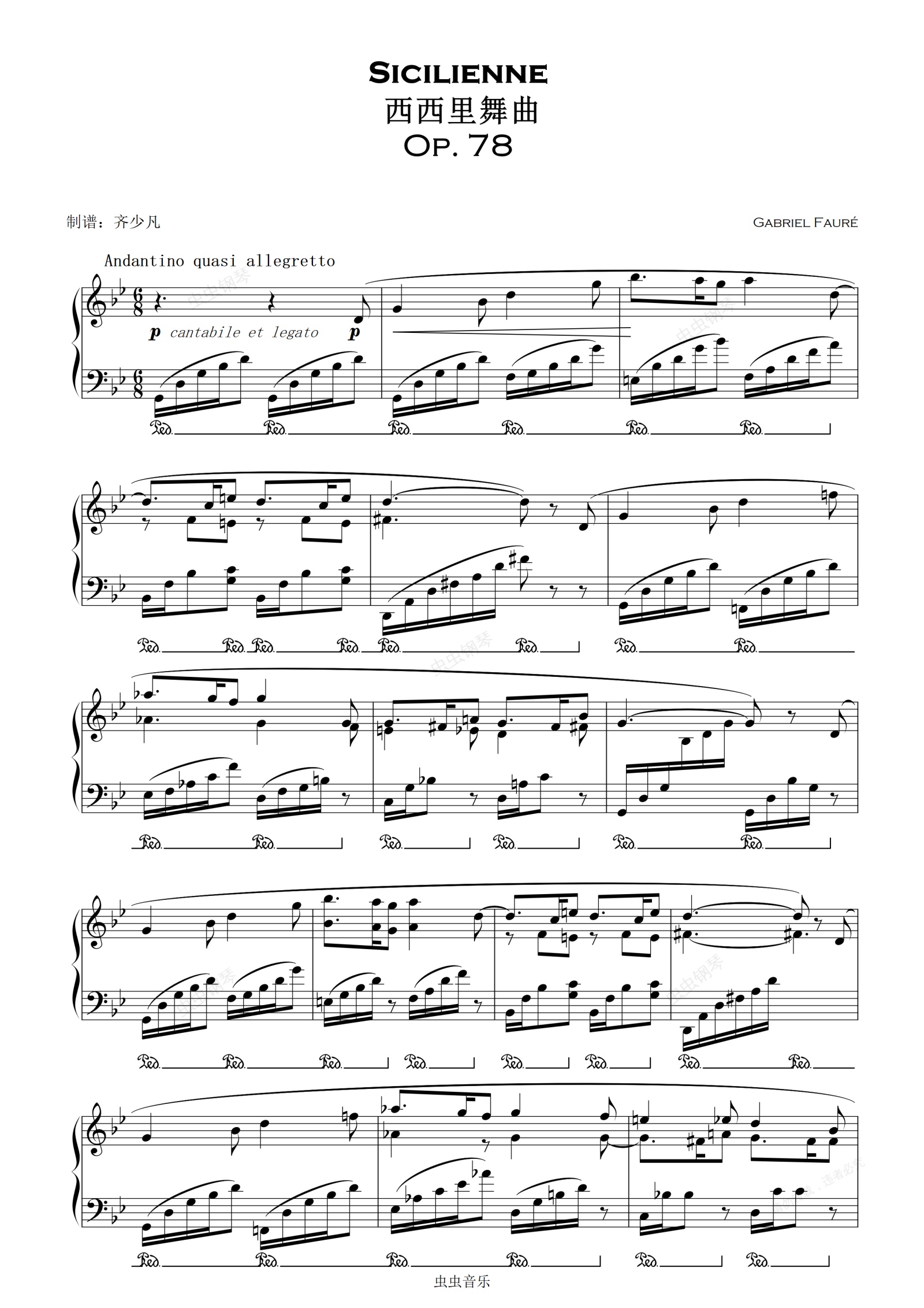 福莱掌控旋律的功力一直被古典乐界称道,他展现了一种神祕而又清晰的感觉。《西西里舞曲》( Op.78),作于1893年,原是一首独立的大提琴作品,主题是一支牧歌风的旋律,典雅秀丽,带有冥想意味,最富于民间特点。
