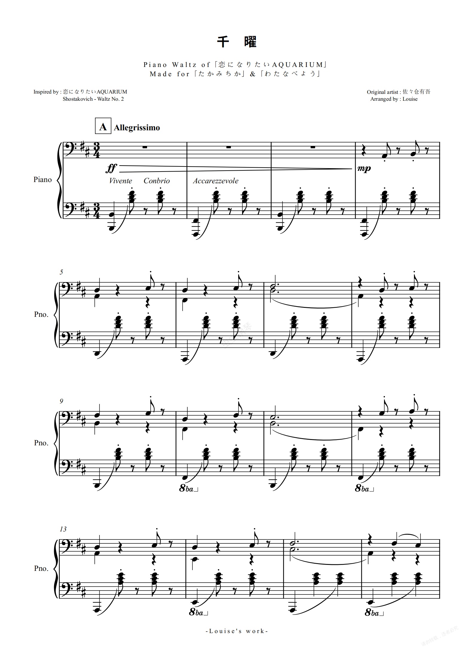 钢琴谱:千曜(恋になりたいAQUARIUM Pno. Ver.)