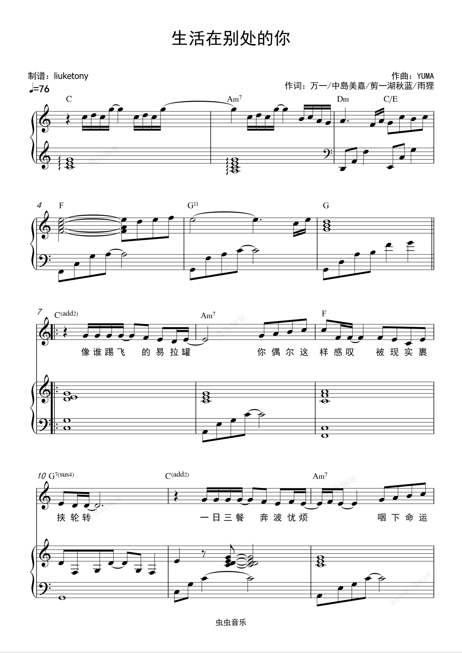 钢琴谱:生活在别处的你 Another me 毛不易新歌