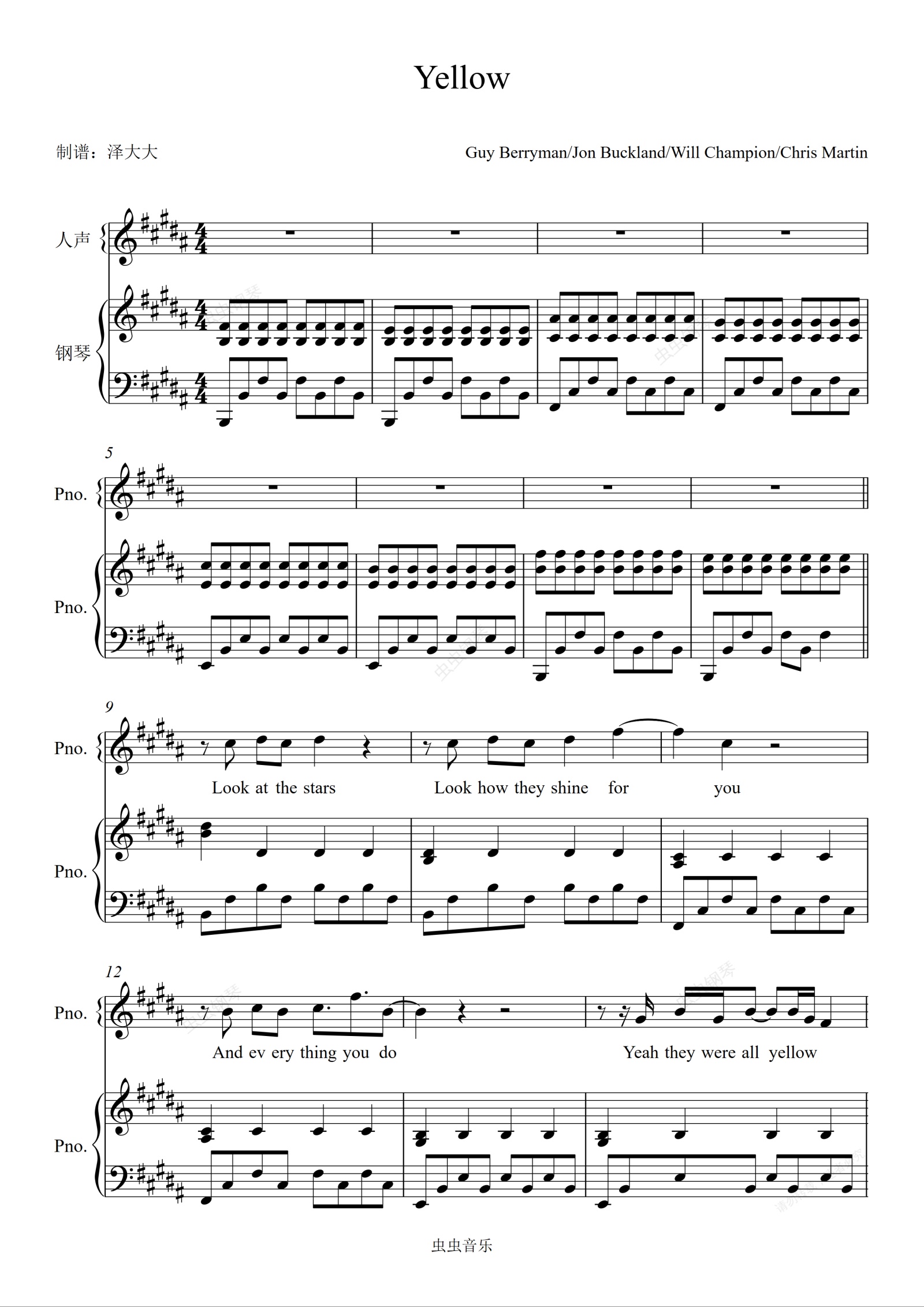 钢琴谱:Yellow【原调弹唱附词】泽大大 Coldplay